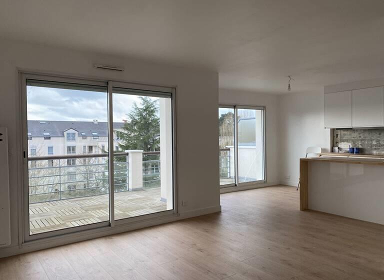 Seule chargée - Nantes Rond-point de Rennes - Appartement T3 duplex au 4e et dernier étage avec ascenseur Entrée avec placard, séjour avec cuisine aménagée équipée donnant sur un balcon orienté Ouest, arrière cuisine, wc. A l'étage un palier desservant deux chambres, une salle de bain et un wc. Une cave et parking. Prestations actuelles de qualité, beaux volumes, terrasse plein Ouest
