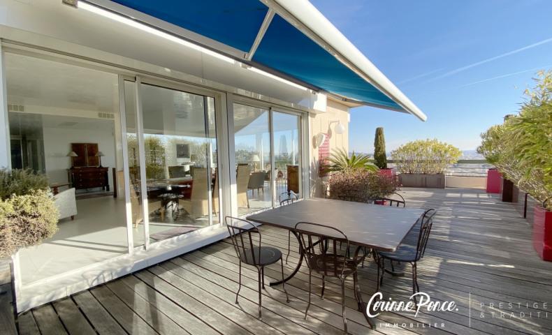 Nimes Centre . Exceptionnel appartement concept "villa sur le toit" en dernier étage d'une résidence de standing sécurisée. Dés l'entrée, on prend un choc, on comprend de suite que ce bien est unique. Cette "villa" sur le toit posséde une surface habitable de 198 m² et une terrasse courant autour de l'appartement de 270 m² avec une vue panoramique extraordinaire à 360 degrés. Les pièces sont spacieuses et baignées de lumière . Tous les murs sont stuqués, les portes sont vitrées opaques. Le vaste séjour vous invite à la contemplation par les larges baies vitrées. Une merveilleuse cuisine indépendante totalement équipée. Une suite parentale avec une salle de bain balnéo. 2 chambres. Une salle d'eau et 2 Wc complétent ce bien. Toutes les prestations de prestige et de confort y sont. Un garage plus une place de parking extérieur. Un bijou dans un écrin de verdure.La grande classe !