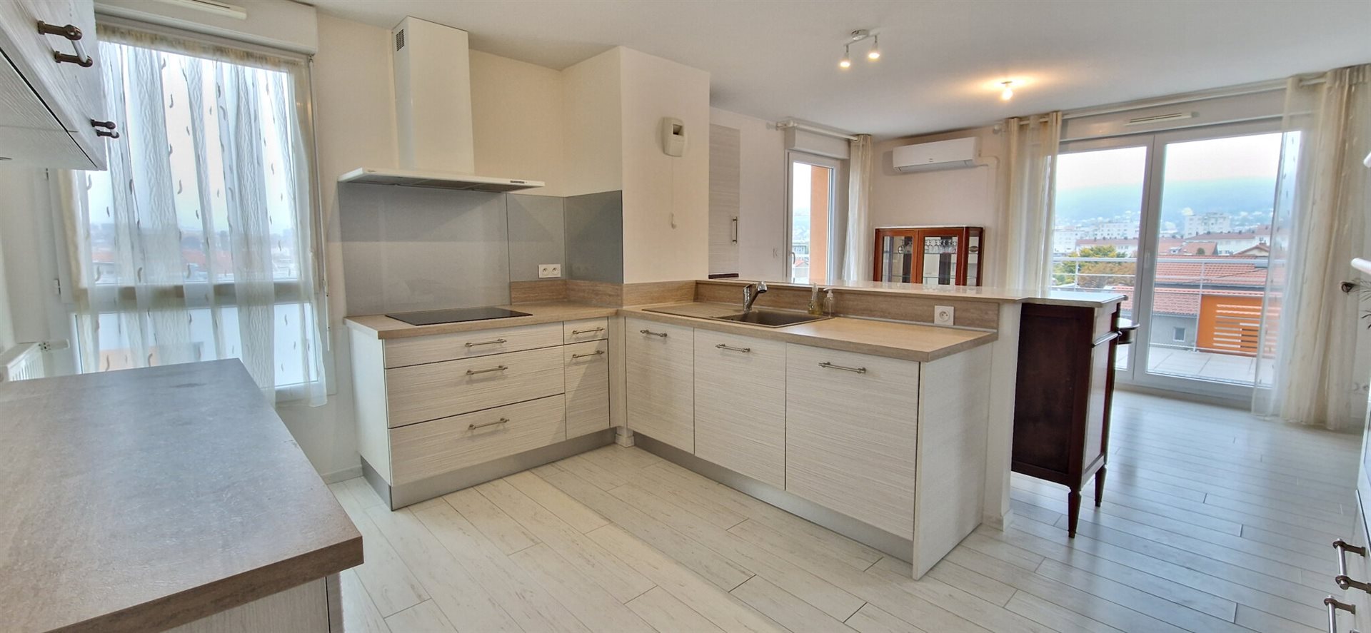 Montjuzet-Lavoisier - Dernier étage - Appartement T5 - Séjour double qui donne sur un balcon/terrasse (Expo So) - Cuisine ouverte et équipée (Mobalpa) - 3 chambres - salle de bains et salle d'eau avec Wc - Wc individuel - Entrée et dégagement avec placards. Chauffage individuel gaz - Bloc climatisation dans le séjour- Fenêtres double vitrage avec volets roulants motorisés. Fibre. Cellier et garage double avec portes motorisées.