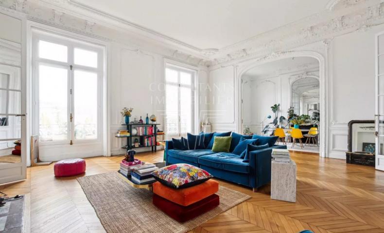 Exclusivite. Paris Xvii. Appartement de prestige traversant en étage élevé bénéficiant de 4m de hauteur sous plafond. Au troisième étage d'un immeuble en pierre de taille fin XIXe, de standing exceptionnel, magnifique appartement d'une superficie de 350 m2 disposant de 4 grandes chambres, une somptueuse triple réception aux volumes impressionnants , une grande cuisine dînatoire à proximité immédiate, plusieurs salles de bains. Cet appartement est traversant et extrêmement lumineux grâce à l'absence de vis à vis de part et d'autre et offre une vue dégagée au-dessus des arbres à proximité de toutes les commodités, sectorisation Carnot. En annexe une immense cave aux volumes généreux, et possibilité d'achat d'un emplacement de parking ou d'un immense box pouvant aussi servir de remise dans la très belle cour de l'immeuble. Ce bien rare peut également être complété par un appartement mitoyen grand deux pièces de 62 m2, ces deux biens étant situés sur le même palier et proviennent de la division d'un seul et même appartement en plusieurs lots. Dossier sur demande. Travaux à prévoir. Consultants Immobilier Paris