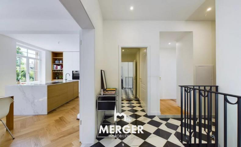 L'immobiliere Merger vous propose, à 5 Mn des Institutions Europeenes - A deux pas du Tram et des écoles - Idéalement bien placé au cœur de la Robertsau dans une petite rue peu passante, à proximité de toutes les commodités, Magnifique Appartement D'architecte 5/6 Pièces de 159 m² sur deux niveaux prêt à être occupé par ses futurs propriétaires! Prestations Haut de gamme, domotique, huisseries sur-mesure, 333 m² de jardin privatif paysagé entièrement clôturé, terrasses, 2 stationnements & cave. Lumineux, Calme Petite copropriété de deux propriétaires comprenant 3 lots principaux. Chauff et eau chaude ind. Par Pac