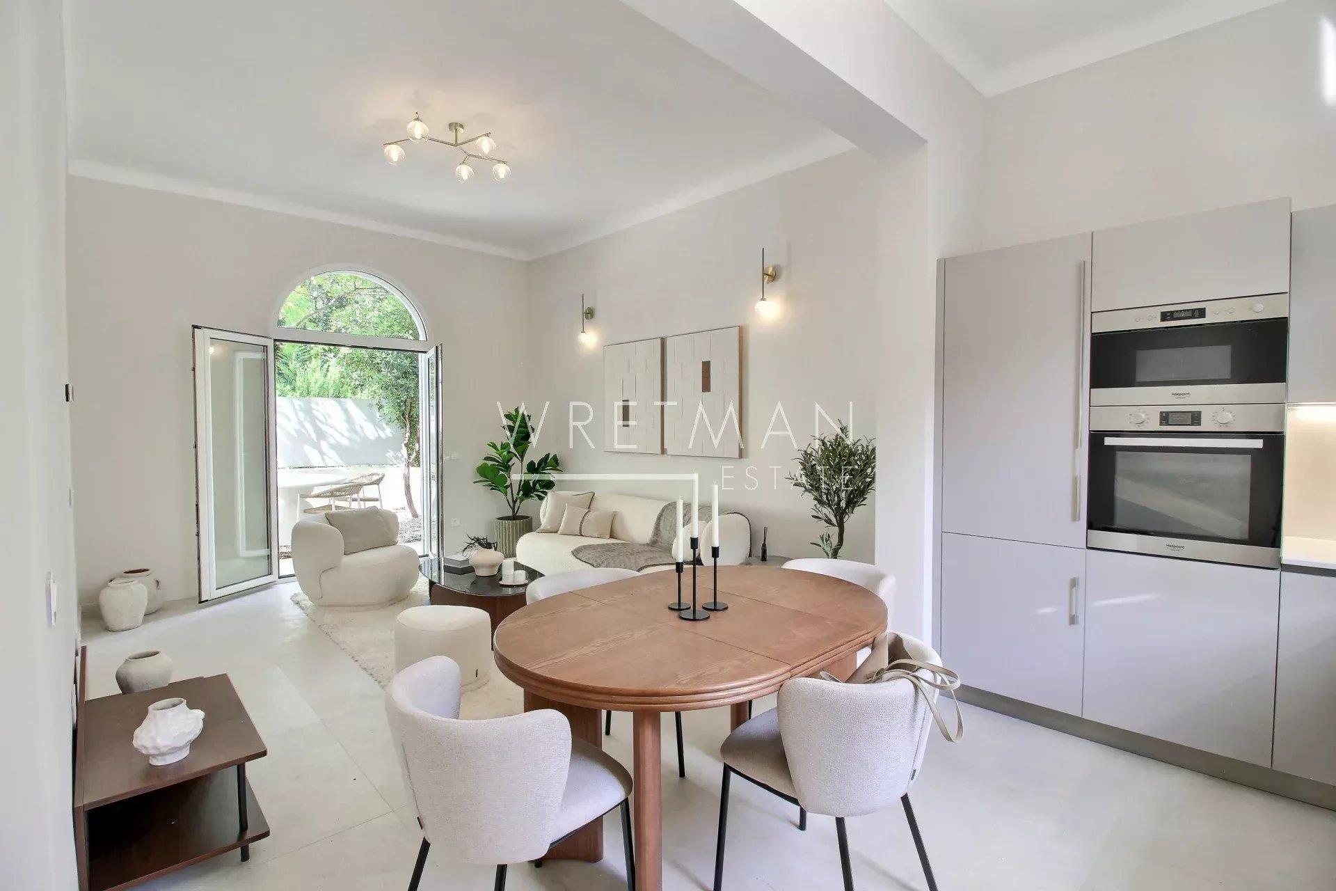 Dans un quartier résidentiel verdoyant, au calme d’une charmante impasse, cette maison de ville des années 30 entièrement rénovée avec goût se situe à seulement 400 mètres de la mer et de la Promenade des Anglais. Idéalement placée, elle bénéficie d’un accès direct aux commodités avec commerces à 250 mètres et tramway à 5 minutes à pied et bénéficie de deux places de parking extérieurs. Discrètement jumelée, cette demeure pleine de cachet, exposée Est-Ouest, profite d’un ensoleillement optimal tout au long de la journée. Entièrement rénovée dans un style contemporain, elle offre 135 m² habitables sur un terrain clos, facile d’entretien, avec deux places de stationnement privatives devant la maison. La maison principale se compose: Au rez-de-chaussée : une belle pièce de vie avec une cuisine équipée et un séjour lumineux ouvrant sur la terrasse et le jardin. Ce niveau comprend également des toilettes invités ainsi qu’une salle de bains avec douche et baignoire. À l’étage : un espace nuit avec trois chambres dotées de penderies sur mesure, une salle d’eau avec toilettes. Le niveau inférieur, en rez-de-jardin, dispose d’une vaste terrasse de 33 m² à ciel ouvert, menant à un appartement indépendant de 45 m². Idéal pour accueillir vos invités, ou générer un revenu locatif. Cette maison bénéficie de prestations soignées et modernes : climatisation intégrée réversible, fenêtres aluminium en double vitrage. Deux annexes offrent un espace supplémentaire de rangement.