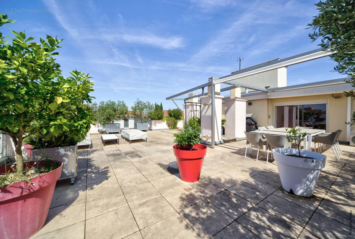 Collection Roseraie - Le rooftop Découvrez ce magnifique appartement de 100m2, situé au dernier étage d'un immeuble de standing avec ascenseur, offrant un confort de vie exceptionnel. Niché dans un environnement paisible, ce bien unique se distingue par ses espaces généreux et ses prestations haut de gamme. L'appartement, orienté sud-ouest, bénéficie d'une luminosité optimale tout au long de la journée. En franchissant la porte, une entrée spacieuse vous accueille, s'ouvrant sur un grand séjour baigné de lumière, prolongé par une spectaculaire terrasse de 125m2, parfaite pour des moments de détente ou des réceptions en plein air. Le bien comprend trois chambres confortables. La suite parentale, située au fond du couloir, est climatisée et dispose de placards intégrés ainsi que d'une salle d’eau privative. Les deux autres chambres, spacieuses et lumineuses, sont idéales pour des enfants, des invités, ou pour aménager un bureau. La salle de bain centrale est équipée d'une baignoire, offrant un espace parfait pour la relaxation, et un Wc suspendu indépendant est également disponible. À gauche de l'entrée, la grande cuisine, entièrement équipée, est dotée de volets roulants automatiques sur toutes les fenêtres, garantissant confort et sécurité. Le bien inclut également un parking extérieur, apportant une commodité supplémentaire. Pour le confort thermique, un chauffage au gaz performant est installé, et les charges de copropriété s'élèvent à 490€ par trimestre, incluant l’entretien des espaces communs et les services de l’immeuble. Ne manquez pas l'opportunité d'acquérir ce bien rare et d'exception, idéalement situé et offrant des prestations de grande qualité. Contactez-nous pour organiser une visite privée et laissez-vous séduire par ce cadre de vie unique.