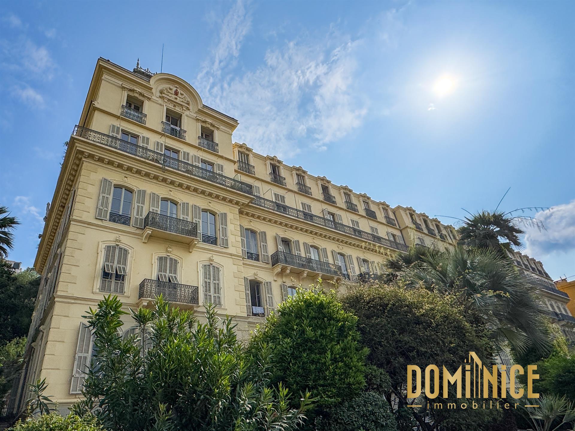 Dans un des plus beaux Palais du boulevard Carabacel, construit en 1906 comme un Grand Hotel, devenu immeuble d'habitation, à la jonction du centre ville et de Cimiez, nous proposons en exclusivité ce grand 3 pièces de 135 m2 + balcons. Situé dans la partie la plus noble de l'immeuble, accessible par son très chic escalier monumental et ses magnifiques parties communes, ou son ascenseur, vous découvrirez un appartement exposé Sud Ouest en position dominante sans vis-à-vis direct. L'appartement dispose d'un grand séjour de 40 m2, d'une cuisine attenante, et de 2 grandes chambres, disposant toutes deux de mezzanines. Une chambre de 24 m2 + 13 m2 de mezzanine et une de 12 m2 + 9 m2 de mezzanine. Dans l'appartement qui est à l'étage noble : 2 balcons filants, climatisation, une salle de bains, une salle d'eau et un Wc indépendant, ainsi que de nombreux rangements. Vous disposerez d'une cave + un casier à vin personnel dans la grande cave à vin du Palais. La copropriété sécurisée qui dispose d'un grand jardin entretenu, propose un parking collectif et un gardien. Au calme mais proche de tout commerces, écoles et transports : notamment les commerces et tramway du secteur Durandy/Wilson, ou Lépante. Les quartiers Jean Médecin, La Coulée Verte et la Place Garibaldi sont à quelques minutes à pieds. Emplacement et immeuble très recherché