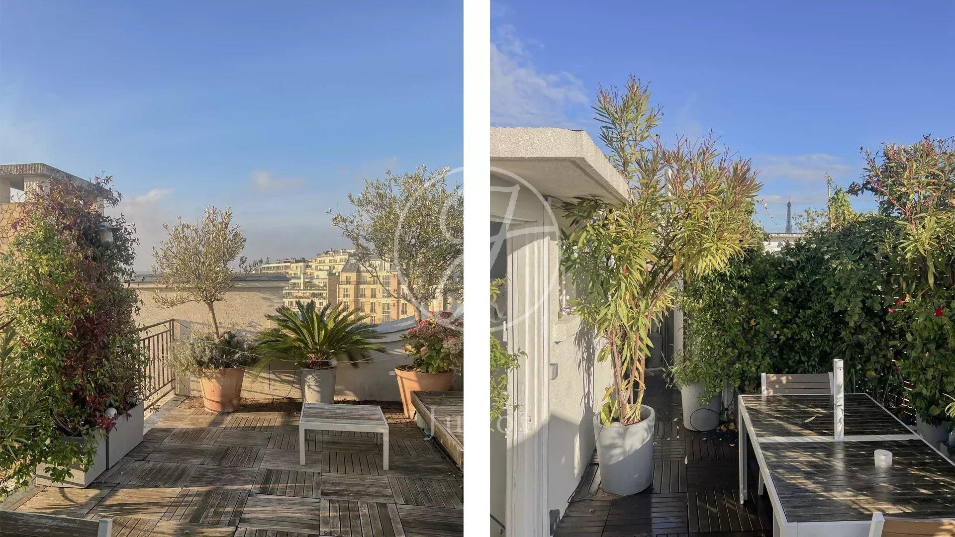 Rare. À deux pas du village d'Auteuil, niché au huitième et dernier étage par ascenseur d'une belle copropriété gardiennée, charmant studio de 35,20m² loi Carrez avec toit terrasse. Baigné de lumière, il comprend un espace nuit avec salle de douche et dressing (possibilité d'ajouter une cloison afin d'avoir une chambre séparée) et un espace vie avec salon et cuisine, le tout donnant accès à un balcon orienté Sud. À l'étage, son somptueux toit terrasse de 32,49m² arboré et aménagé bénéficie d'une vue panoramique sur la tour Eiffel et tout Paris. Une cave complète ce bien. Environnement calme tout en étant à proximité des commerces et transports.