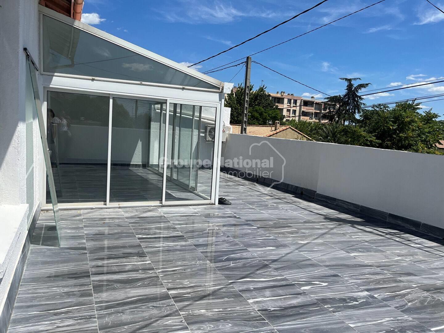 Magnifique maison de ville refaite entièrement , comprenant: Grand hall d'entrée ( d'environ 10m²), jolie cuisine équipée (four, plaque, hotte, frigo) ouverte sur pièce à vivre avec clim réversible, donnant sur véranda (d'env13m²) , terrasse (d'environ 47m² habitables, 3 chambres dont 1 avec clim réversible, salle d'eau avec toilettes (machine à laver). Le tout avec une véranda d'environ 13m² et une terrasse d'environ 47m² . Jolies prestations: cuisine neuve, 3 clims réversibles, vidéophone. Libre octobre 2025