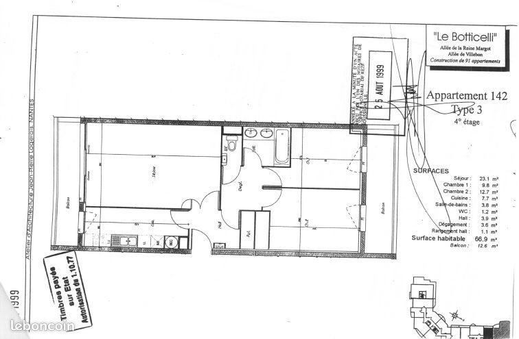 Appartement T3 Nantes, dans la Résidence Botticelli, un appartement T3 n° 142 (lot 3020), situé au 4ème étage avec ascenseur du bâtiment 1, d'une surface habitable de 66.90 m² , comprenant : entrée avec placard, séjour, cuisine, dégagement, deux chambres, salle de bains (2 vasques), wc. Balcon. Chauffage individuel électrique. Un Box n° 520 (lot 3106) au niveau -1 du bâtiment 1.Eau chaude : individuel électrique. Entretien parties communes, ascenseur et espaces verts communs, compris dans les provisions sur charges mensuelles et donnant lieu à une régularisation annuelle. Les honoraires de location Ttc (à la charge du locataire) incluent le montant de rédaction des états des lieux facturé pour 200 euros Ttc, après réalisation lors de l'entrée dans les lieux. Disponible le . Plus de détails sur notre site internet Afedim. Les informations sur les risques auxquels ce bien est exposé sont disponibles sur le site Géorisques : Référence annonce : Date de réalisation du diagnostic : Honoraires à la charge du locataire : 869 € Ttc Dépôt de garantie : 822 € Montant des charges : 73 € / mois Montant estimé des dépenses annuelles d'énergie pour un usage standard : entre 649 € et 879 € par an. Prix moyens des énergies indexés sur l'année 2021 (abonnements compris)