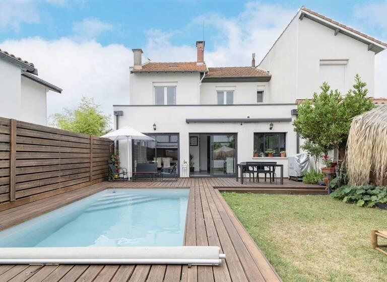 Toulouse Lardenne, belle maison de type 6 d'environ 154m² entièrement rénovée, charme des années 50 et extension moderne, beau séjour / salle à manger avec cuisine ouverte entièrement équipée, 5 chambres dont 1 au rez-de-chaussée, 2 salle d'eau, cave et garage. Terrasse en bois avec piscine sur un agréable terrain de 328m². Prestations de qualité. Proche commerces, transports et accès rocade.