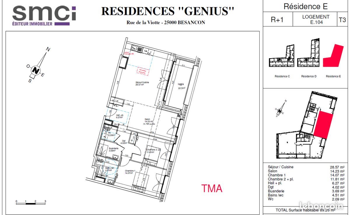 Situé à proximité immédiate de la Gare Viotte, Genius est une résidence neuve de standing au design remarquable, primée au prix national de l’Art Urbain. Une situation idéale, au calme, tout en étant à proximité du centre-ville (à 10 minutes à pied de la Boucle), des transports en commun (tram, train, bus), des services et des commodité situés au cœur des Chaprais. Spacieux appartement de 90m2 exposé à l’Est avec une grande pièce de vie de plus de 42m2 avec un accès direct à sa loggia extérieure de 10m2. Cet espace est facilement modulable afin de créer un second salon plus intimiste, un espace bureau… L’espace nuit se compose de deux chambres, l’une de12 m2 et une seconde de 14m2 qui bénéficie de sa salle d’eau privative. Equipée d'un ascenseur, la résidence est entièrement sécurisée par un système Intratone. Livraison immédiate. Parking en sous-sol disponible sur demande sous la résidence. Belles prestations : carrelage 60 60, parquet en chêne dans les chambres, placard aménagé, parties communes soignées.