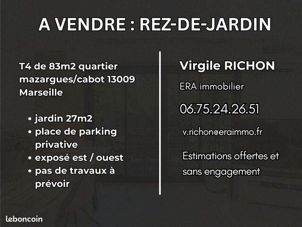 A vendre : appartement T4 en rez-de-jardin entre mazargues et le cabot 13009 Marseille Nous vous proposons à la vente ce superbe appartement en rez-de-jardin situé entre mazargues et le cabot. Numéro du commercial : O6. Mr. Richon Cet appartement intégralement refait ne nécessite pas de travaux. Il est idéalement exposé (est-ouest) et vous fera bénéficier d'un calme absolu au sein d'une copropriété arborée et très bien entretenue. Ce bien possède un jardin de 27m2, une place de parking privative et est idéalement agencé avec un grand séjour et trois chambres. Plus de photos sont disponibles sur demande. Les informations sur les risques auxquels ce bien est exposé sont disponibles sur le site Géorisques : Georisques. Gouv. Fr Référence annonce : Vr-26779 Date de réalisation du diagnostic : Les honoraires sont à la charge du mander plus d'informations