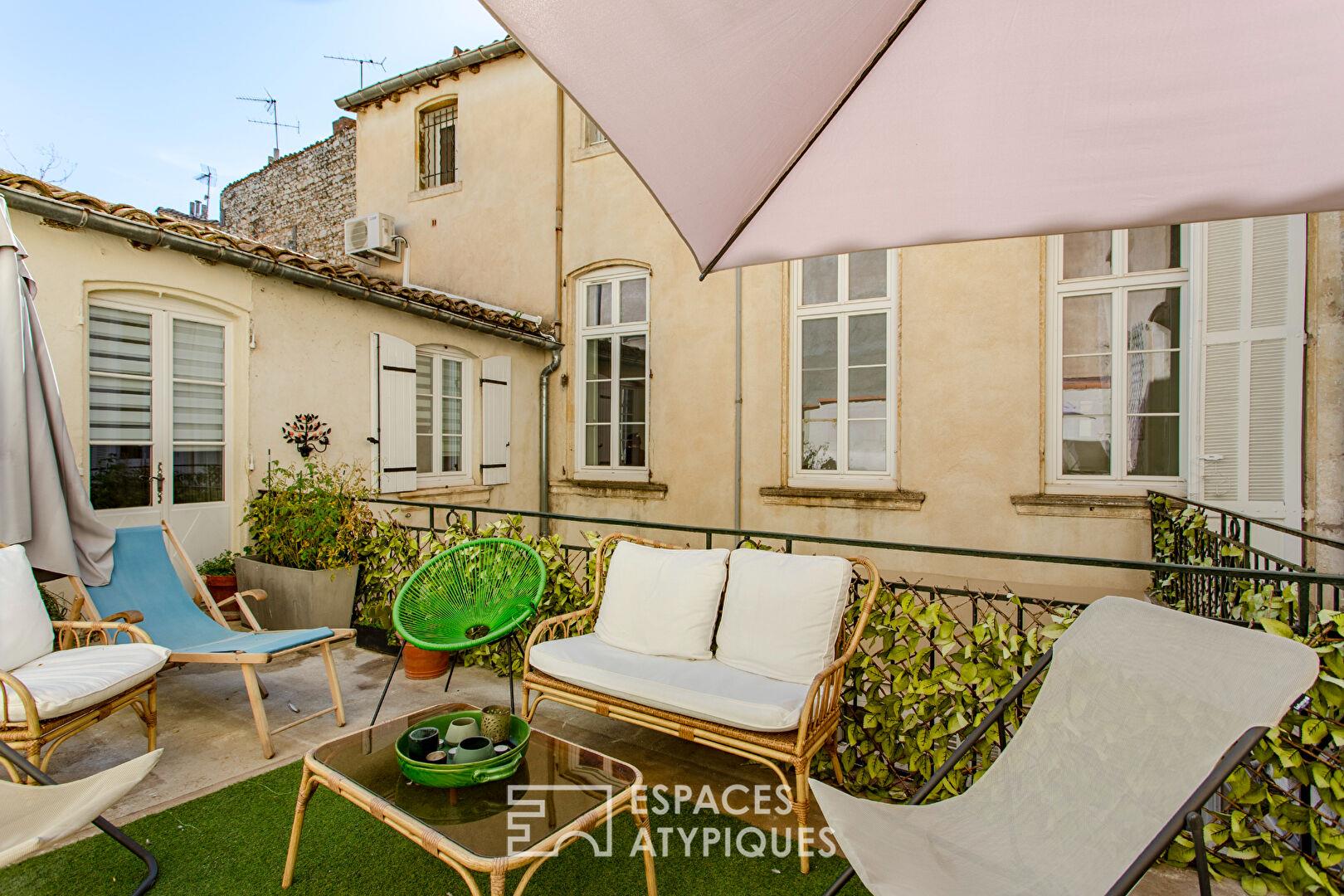 Situé au coeur de Nîmes, à quelques pas du monument classé à l'Unesco, cet appartement bourgeois de 224 m2 (loi Carrez) et 283m2 au sol propose des volumes généreux et un caractère singulier. L'escalier imposant et noble de cette petite copropriété dessert au 1er étage surélevé, une vaste entrée, un double salon de 57m2 et une grande cuisine/ salle à manger donnant sur une terrasse de 25m2 orientée plein Sud. Il propose cinq chambres dont une suite parentale avec dressing et une grande salle d'eau avec baignoire îlot et douche ainsi qu'un grand bureau et une deuxième salle d'eau. Les éléments anciens (belles hauteurs sous plafond, moulures, barres aux sols, cheminées en marbre, menuiseries...) côtoient avec délicatesse la modernité des lieux. De nombreux rangements et une cave complète ce bien. Classe Energie: E / Classe Climat: B - Montant moyen estimé des dépenses annuelles d'énergie pour un usage standard, établi à partir des prix de l'énergie de l'année 2021 : entre 3900 euros et 5340 euros abonnement inclus. Contact Alexandra : 06 18 07... Copropriété de 11 lots - dont 11 lots habitation. (Pas de procédure en cours). Charges annuelles : 2066.8 euros. Alexandra Cluchier (Ei) Agent Commercial - Numéro Rsac : 890 423 205 - Nîmes.