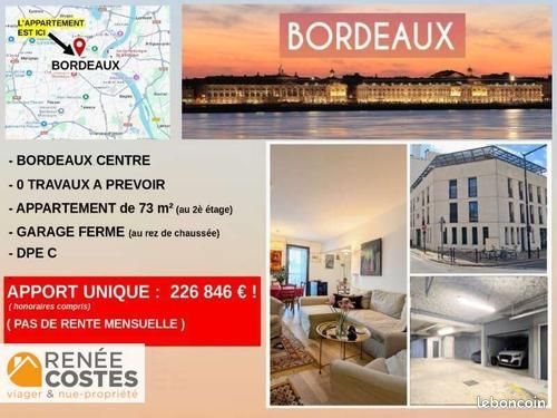 Vente en nue propriété - H78 ans - Bordeaux (33000) Bordeaux Centre - Investissement clé en main Appartement de 73 m² parfaitement entretenu, garage fermé en rez-de-chaussée, zéro travaux. Un placement sécurisé , à prix fixe ( aucune rente mensuelle ) pour 226 846 Eur honoraires R.Costes inclus. Age : Homme de 78 ans Bouquet : 226846 Eur Rente : 0 EUR/mois Prix d'achat : 226846 Eur Nous vous rappelons qu'en Vente en nue propriété le vendeur reste chez lui, vous ne pouvez y habiter. Dans le cadre d'une « Vente en Nue-propriété », vous achetez le bien avec un paiement immédiat, il n'y a pas de rente à verser. Pour l'investisseur, cela s'apparente à un investissement locatif sécurisé, avec un seul occupant (le vendeur), et pour lequel il reçoit la totalité des « loyers » au moment de l'acquisition sous forme de décote d'occupation (usufruit ou droit d'habitation). Descriptif du bien : Au coeur de Bordeaux, donne sur le boulevard ( séjour + cuisine ) et la rue en perpendiculaire ( pour les chambres) , situé au second étage, lumineux , parties vie et nuit bien séparées, et cerise sur le gâteau : un Grand Garage Fermé ( il est spacieux car c'est un accès pour Pmr) situé au rez de chaussée, avec aussi un garage sécurisé à vélos, très bien situé avec l'arrêt de bus brandenburg en bas du bâtiment , - A 30 min A Pied ( ou 15 min à vélo) des quais, des allées de Tourny / Place des quinconces, Hotel de ville... - A 0 min à pied : Ligne bus 9 en bas du bâtiment ( rejoint lignes de trams, dessert la gare Sncf sans changement) Cet appartement de 73,18 m² Loi Carrez ( dont la construction du bâtiment date de 2012 , 0 travaux à prévoir) . - 1 entrée dégagement de 8,76 m² - 1 Wc indépendant de 1,46 m² - 1 spacieux séjour de 22,51 m² - 1 cuisine semi ouverte de 12,34 m² - 1 cellier de 1,99 m² - 2 chambres de 10,54 m² et 11,86 m² (avec placards intégrés) - 1 salle d'eau de 3,72 m² . Conclusion : . Appartement sans travaux à prévoir, excellent investissement dans le temps car il est au coeur de Bordeaux , très bien entretenu, bien situé et le garage au rez de chaussé est un vrai atout en centre ville ! Analyse financière : Le Gain : . En partant d'une valeur libre de 335 570 Eur . = Beneficiez d'une Economie Immediate de 108 724 Eur ! . = Achetez Cet Appartement (occupé) pour 226 846 Eur (honoraires compris) ! ..................................................... Comment L'acheter : . = Versez Un Apport Fixe de 226 846 Eur ( honoraires R. Costes compris) = Pas d'aléa de rente. = Emprunt bancaire possible Investissement Non Fiscalisé , socialement responsable, sécurisé, qui vous permet de vous créer un potentiel patrimonial dans le temps ! ------------------------------------------------------------- Prix Au m² : . = 2739 Eur / m² ( au lieu de 4596 Eur en libre) en comptant un appartement de 73 m² + un garage fermé au rez de chaussée du bâtiment en plein coeur de Bordeaux ! --------------------------------------------------------------------------- Loyers : . = Meublé : 1197 Eur Hc (avec garage compris et respect de l'encadrement des loyers) -------------------------------------------------------------------------- Charges de Copro : . = Charges totales : 1600 Eur = dont Charges propriétaire : 553 Eur / an, soit 50 Eur / mois = dont charges dites locatives : 1047 Eur / an , soit 87Eur / mois ---------------------------------------------------------------- = Taxe foncière : 1436 Eur ( 1636 Eur - la taxe d'ordures ménagères de 200 Eur est due par le vendeur occupant) Idéal à terme pour du locatif, y habiter ou une revente assurée avec le temps dans ce secteur bien placé, donc très recherché Référence annonce : Consommation énergétique : 88 kWh/m²/an Emission de gaz à effet de serre : 17 CO2/m²/mander plus d'informations