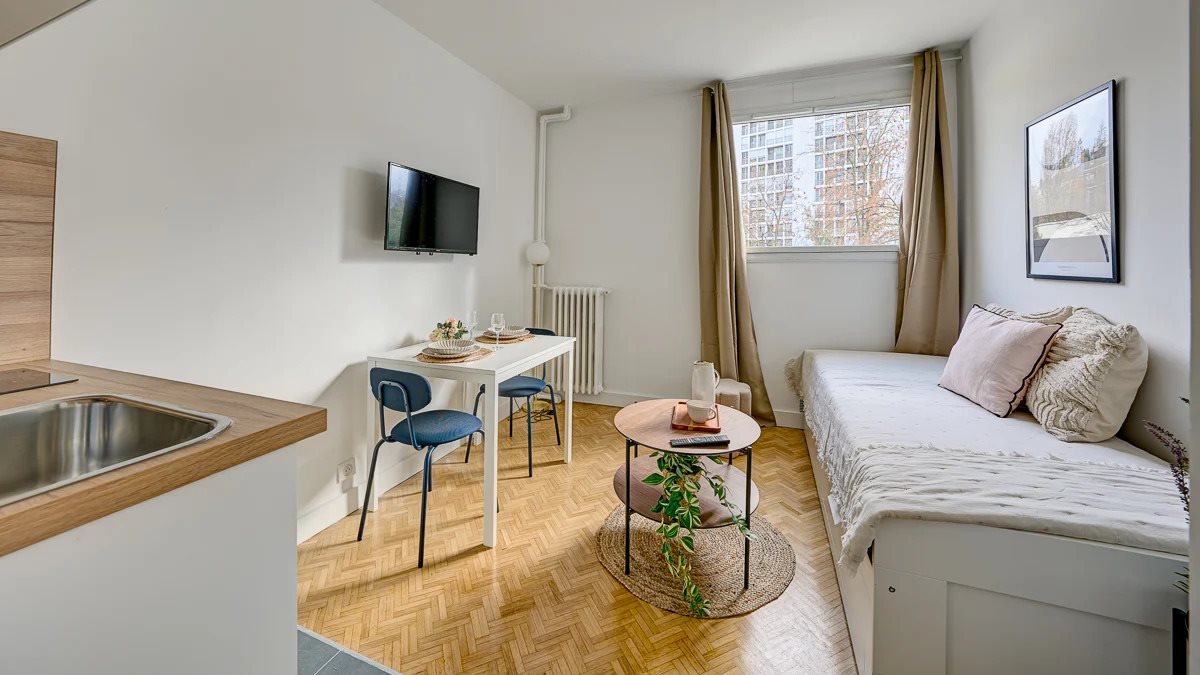 Rue Saint Charles. Agréable studio meublé, calme sur jardin, situé à deux pas du Parc André Citroën au cœur d'un quartier vivant et commerçant. Posez vos valises dans votre nouveau chez vous au 199, rue St Charles à Paris 15 : un appartement moderne et chaleureux, entièrement meublé et équipé . A l'extérieur, un jardin tranquille. A l'intérieur, un studio refait à neuf de 16m² au 1er étage. Une entrée, donnant accès à la pièce de vie, moderne et lumineuse avec une cuisine ouverte équipée (Nespresso, réfrigérateur, micro-ondes, plaque de cuisson), et avec un coin repas. Une salle d'eau avec toilette complète ce bien. Parquet, double vitrage, accès fibre. Appartement meublé tout équipé : lit (couchage de 90x190), table à manger avec 2 chaises, commode, réfrigérateur, micro-ondes, machine à laver le linge, Nespresso, accessoires de cuisine, vaisselle, accessoires pour le ménage et l'entretien. Ce logement est situé dans une résidence gérée, offrant des services à la carte. Il se trouve au sein d'une petite résidence calme et sécurisée, disposant d'un agréable jardin intérieur et d'une bibliothèque à partager, et de la présence au quotidien de personnel disponible pour répondre à vos attentes. La résidence est équipée de la fibre optique, d'ascenseurs, d'un local vélos et dispose d'emplacements de parkings intérieurs, voitures et motos. Idéalement situé dans la rue Saint Charles, à proximité de la rue de la Convention, ce quartier très commerçant et recherché accueille de nombreux marchés locaux et les commerces du centre Beaugrenelle. A quelques pas, vous disposez de la station de métro Lourmel (ligne 8), vous permettant des déplacements rapides dans Paris. Dossiers étudiés pour des revenus qui représentent au moins 2 fois le montant du loyer. Honoraires à la charge du locataire (prix maximum) : 240,00€ Ttc, dont 48,00€ pour l'état des lieux