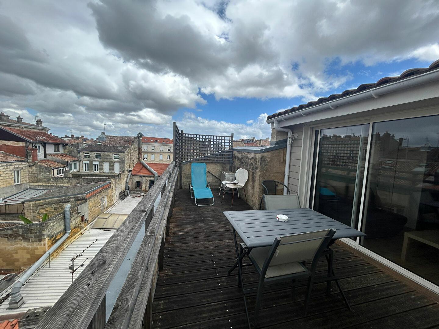 T1 Bis meublé d'une superficie de 19m2 situé au 3ème étage sans ascenseur d'un immeuble en pierre rue Beaufleury à proximité immédiate de la place de la Victoire et du tram B. Cet appartement climatisé est composé d'une pièce de vie, d'une cuisine aménagée et équipée, d'une salle d'eau avec Wc et d'un coin nuit mansardé. Vous bénéficiez en plus d'une superbe Terrasse donnant sur les toits de Bordeaux. Dpe C Libre de suite LOYER : 890€ charges comprises ( dont 150€ de charges pour l'eau froide, internet, entretien des parties communes, éléctricité des parties communes, provision taxe ordure ménagère) Dépôt de garantie : 1480€ Honoraires d'agence à la charge du locataire : 248,69€