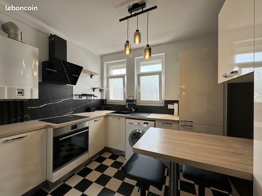Très bel appartement traversant entièrement restauré fin 2024 au deuxième étage de petite co-pro avec parking privatisé, proche boucle, au 50c rue de Dole. Immeuble des années 60 bien entretenu avec façade refaite et isolation intérieure de l’entièreté de l’appartement. Pièce de vie avec petit balcon Est, 2 chambres dont une avec dressing + un bureau. Parquet ancien vitrifié. La Fibre. Cuisine super-équipée avec électroménager neuf et lave/sèche-linge Bosch 1400 tours. Coin bar. Chaudière à condensation gaz de ville individuel. Volets alu avec télécommandes. Stores. Salle de douche. Wc suspendu séparé. Suspensions, appliques et objets de décoration. Mobilier possible en sus. Cave avec accès et local vélo sécurisé. Grenier. Disponible à partir du 19 ou 20 septembre.