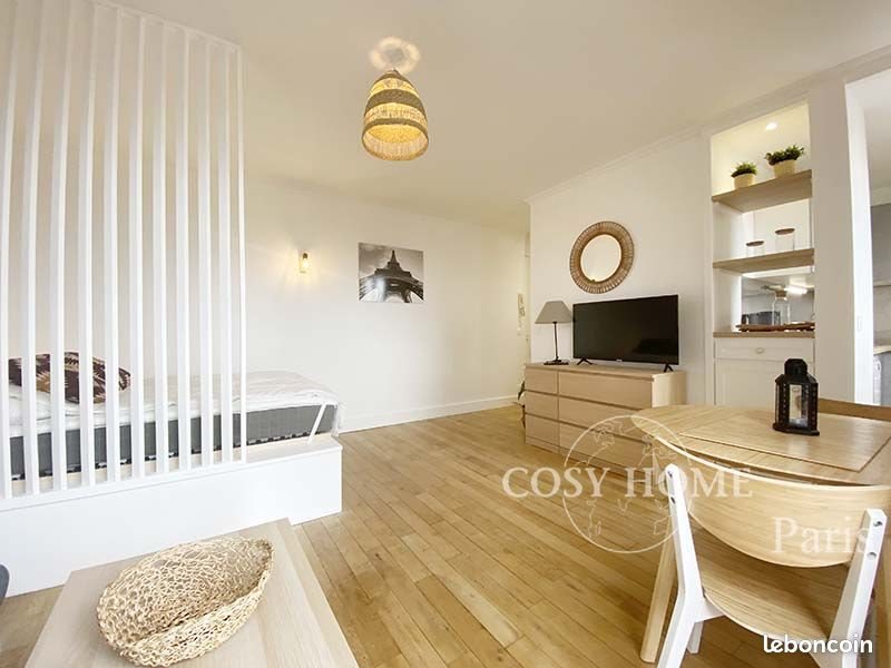 Ref 3159 - En plein coeur de Montmartre, Rue Cortot, à 400m du Métro Lamarck-Caulaincourt (L12), beau 2 pièces meublé open-space, entièrement rénové. Cet appartement comprend : une entrée (penderie) un séjour (canapé convertible, Tv écran-plat, commode, table à manger), une cuisine ouverte, aménagée et équipée (lave-vaisselle), un espace chambre (lit double), une salle de bain avec Wc intégré (lave-linge). Chauffage et eau chaude collectifs. Situé au 4ème étage avec ascenseur, belle vue dégagée sans vis à vis. Particulièrement calme et lumineux. Toutes commodités à proximité. Note de confort Cosy Home 4 canapé.