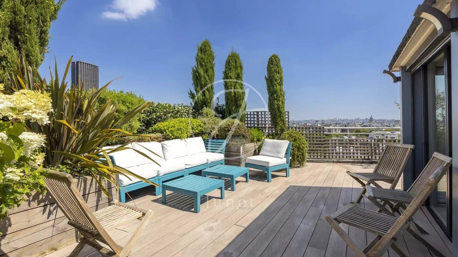 Quartier Denfert-Rochereau, dans un immeuble sécurisé avec gardien, découvrez ce superbe penthouse deux pièces de 68m² loi Carrez, situé au onzième et dernier étage avec ascenseur. Ce bien unique en parfait état, lumineux et climatisé, bénéficie de larges baies vitrées et d’une vaste terrasse arborée de 110m² offrant une vue panoramique dégagée sur les monuments parisiens. Il comporte une entrée, un séjour lumineux avec une cuisine ouverte aménagée et équipée, une large terrasse arborée à la vue dégagée comprenant deux espaces dînatoires, une partie salon d'extérieur et un coin hamac, une suite avec dressing, un espace bureau, une salle de bains et deux toilettes séparées. Nombreux rangements, cave à vin dans le penthouse et local à vélos dans l’immeuble complètent cette offre. Alarme possible. Chauffage collectif ou via la climatisation réversible. Disponible immédiatement. BAIL Code Civil Uniquement. Honoraires bail Code civil (résidence secondaire/bail société): 10%Ht (12%Ttc) du loyer annuel HC. Dépôt de garantie: 7 168,00€. Exclusivité.