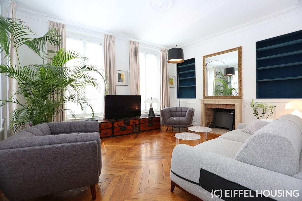 Très bel appartement meublé situé rue de l’Université, à l’angle avec la rue du Bac dans le 7ème arrondissement de Paris. Les stations de métro Rue du Bac (ligne 12), Solférino (ligne 12) et Musée d’Orsay (Rer C) sont toutes proches. Au 3ème étage (avec ascenseur), et d’une superficie de 113m², l’appartement se compose de : d’une entrée d’un salon d’angle lumineux d’une salle à manger d’une cuisine séparée et entièrement équipée d’une grande chambre avec dressing d’une deuxième chambre d’une salle de bains avec baignoire et douche d’un Wc séparé L’appartement est équipé de climatisation dans la salle à manger et la chambre principale. Chauffage et eau chaude individuels au gaz. Gardien, digicode, interphone.