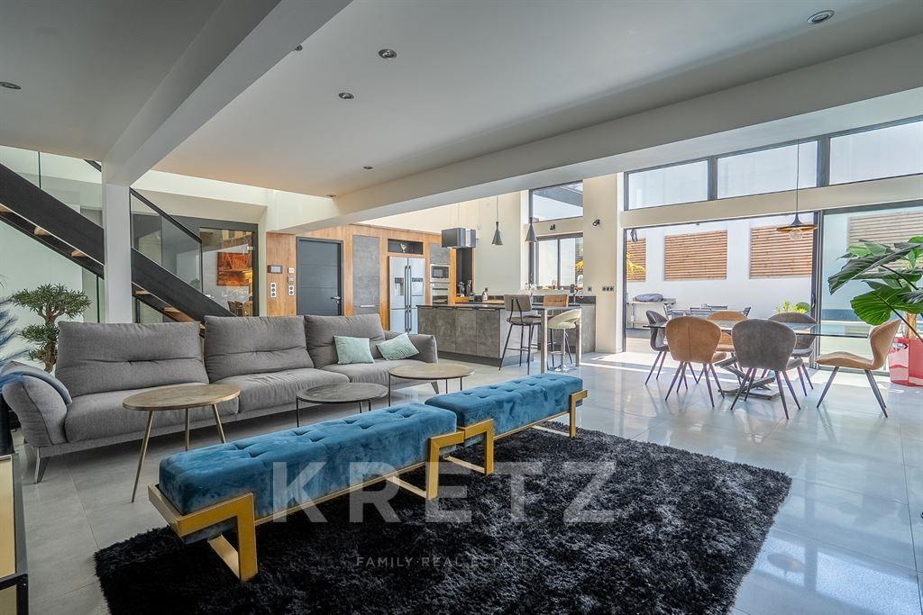 Lorient, hyper-centre. Élégance et Caractère pour ce cocon insolite. Maison sans vis à vis au style californien entre lignes cubiques et épurées. Au rez de chaussée de plain pied sur terrasse: Entrée, cuisine dînatoire, séjour déplafonné hauteur cathédrale, salon, cave à vin, arrière cuisine, buanderie, lingerie, et deux suites parentales avec salle d'eau. Espace bien-être important proposant une salle de sport, un sauna et une piscine chauffée. Au premier étage: espace parental avec chambre, insert, salle de bains avec douche et baignoire double, grand dressing, bureau. Un patio terrassé d'environ 150m2 exposé Sud s'invite comme une pièce de vie supplémentaire, faisant la jonction entre la maison et l'espace bien être. Un double garage profite à ce bien. Chauffage au sol, domotique complète, alarme. Havre de paix clef en main avec un mode de vie idéal à pieds de tous commerces et de la gare de Lorient.