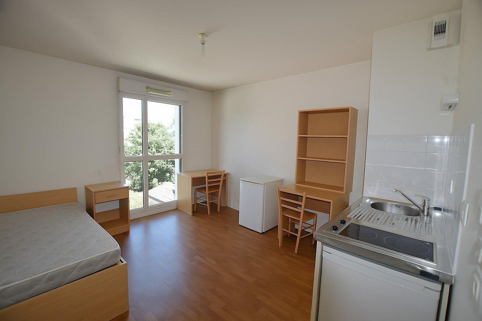 Rennes Thabor - Studio de 22.01m² dans une résidence étudiante, sécurisée. Cet appartement comprend une pièce de vie avec coin kitchenette équipée de plaque et frigo, salle d'eau avec WC. Loyer : 634.94+45de charges +5.92 de Tom = 685.86cc Ref:G115 - disponible à partir du