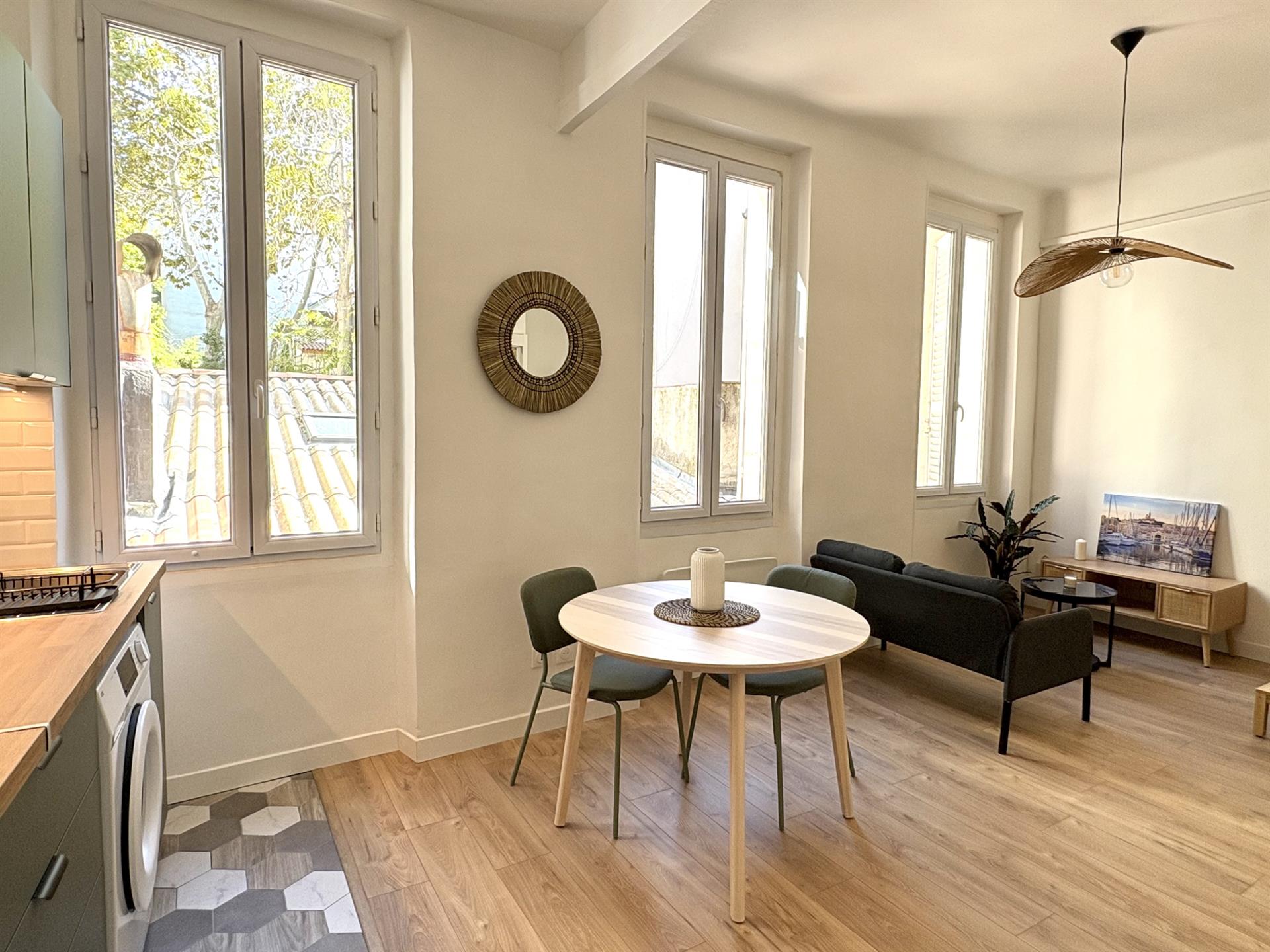 Loyer : 750 € par mois charges comprises charges comprises dont - 20 € par mois de provision pour charges - régularisation annuelle Dépôt de garantie : 1 460 € Honoraires charge locataire : 325 € Ttc En deuxième étage d'un joli immeuble marseillais se trouve ce superbe studio entièrement rénové et meublé avec goût situé côté cour. Il bénéficie d'une cuisine équipée (hotte, plaque, four, frigo + congél, lave linge) ouverte sur un séjour lumineux au calme absolu et une salle de bain avec wc. Idéal pour un étudiant en quête de tranquillité, à 1 min du Tram et à 5min de la Place Castellane et des métros. Une exclu du Cab'
