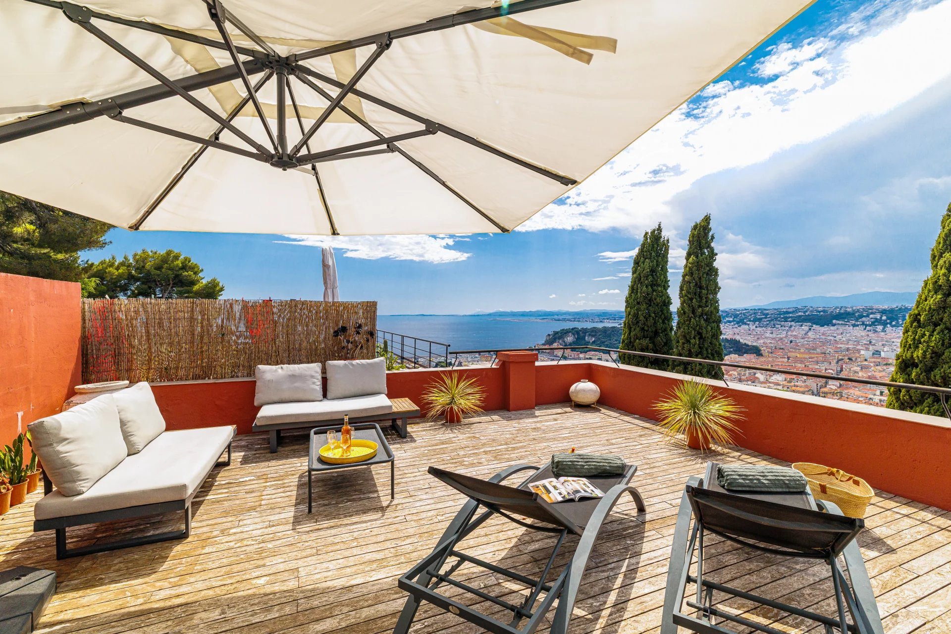 À la lisière du parc forestier du Mont Boron, cet appartement avec une spacieuse chambre et un coin nuit, en excellent état, est niché au sein d’une maison datant des années 1930, divisée en appartements. Situé dans une petite copropriété intimiste de seulement quatre lots, il bénéficie d’un environnement privilégié, au calme, avec une vue panoramique imprenable sur la mer et le port de Nice, grâce à son exposition sud-ouest. L'appartement se compose d’une entrée accueillante, d’un séjour lumineux avec parquet, cheminée et coin bureau, ouvrant sur un balcon offrant une magnifique vue mer. La cuisine ouverte est fonctionnelle et bien agencée. On y trouve également une très grande chambre avec rangements vue sur la verdure, un coin nuit avec rangements, ainsi qu’une salle de bains moderne équipée d’une grande douche et de toilettes. Le véritable atout de ce bien est sa vaste terrasse sur le toit de 70 m² à jouissance exclusive, accessible par un escalier extérieur. Un lieu unique pour profiter du soleil, du calme et d’un panorama exceptionnel sur la ville, le port, la mer et les collines boisées du Mont Boron. L’accès au centre-ville de Nice, au port, aux commerces du Col de...