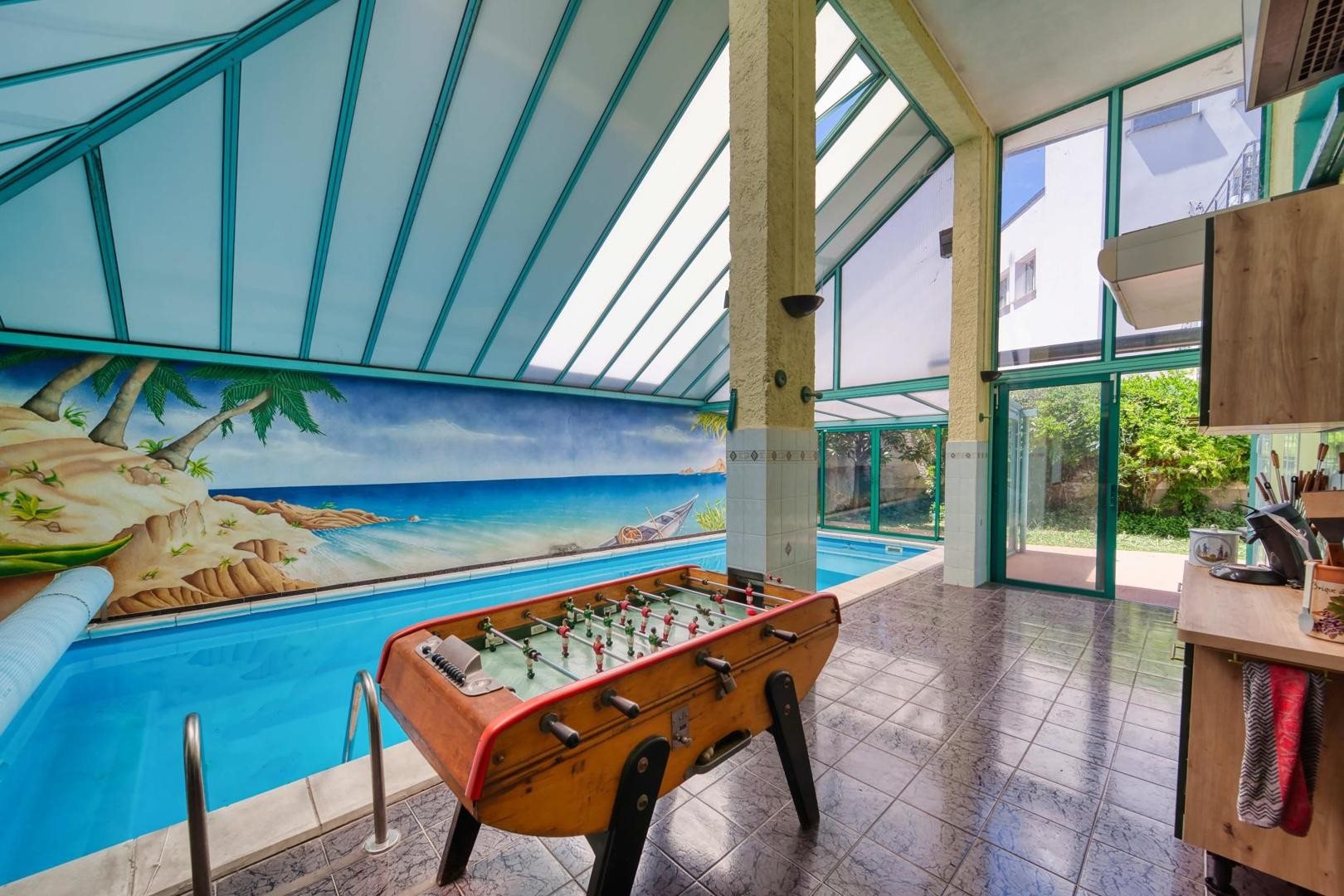 Grenoble, a deux pas du parc pompidou, a 15 minutes a pied du centre ville et proche de toutes les commodites, maison divisee en plusieurs appartements, d'une superficie totale habitable de 425 m², s'elevant sur trois niveaux, equipee d'un monte escalier electrique desservant chaque etage. Rez de chaussee : garage de 51 m², dont une partie avec une hauteur sous plafond de 5 m, ferme par un rideau metallique motorise et disposant d'un wc. Second garage de 35 m², egalement equipe d'un rideau metallique motorise. Piscine enterree de 9 m x 4 m avec revetement pvc arme, nage a contre courant, filtre a sable, fermee par une veranda aluminium de 97 m² et de 5 m de hauteur, avec chauffage de l'eau et de l'air. Elle comprend une cuisine, un wc et une salle d'eau. Acces au jardin ainsi qu'un salon de 40 m² avec escalier menant a la mezzanine du premier etage. Premier etage : mezzanine avec salle d'eau et wc, communicante avec une chambre. Palier donnant acces a un studio independant de 35 m², comprenant une salle d'eau, wc et kitchenette. Deuxieme etage : appartement de 160 m² comprenant un hall d'entree, une cuisine, un salon/salle a manger donnant acces a une terrasse de 18 m² exposee plein sud, trois chambres, une lingerie, wc separes, une salle de bains et une salle d'eau. Troisieme et dernier etage : appartement de charme avec poutres apparentes, d'une superficie de 82,37 m² habitables et 12,53 m² de surface utile, comprenant un salon donnant acces a une terrasse de 18 m² exposee sud offrant une vue imprenable sur les massifs, trois chambres, une salle d'eau et des wc separes. Les portes palieres sont blindees, la maison est equipee d'une alarme, de menuiseries aluminium a rupture de pont thermique et d'un chauffage au gaz dans l'ensemble du batiment. En mitoyennete, un local professionnel de 280 m² en rez de chaussee, loue a une entreprise depuis 1991 avec un bail commercial 3 6 9, generant un loyer de 1 762 € ht par mois.