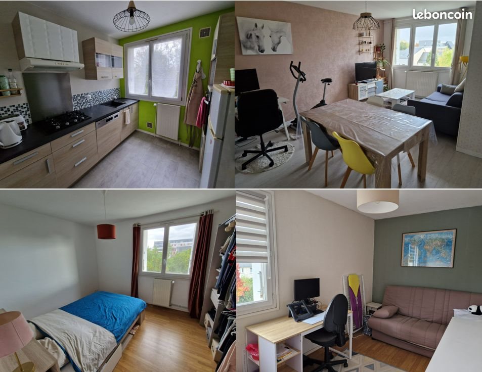 Appartement T3 meublé de 57 m² situé à deux pas de la Rue de Nantes avec tous les commerces (boulangerie, pharmacie, super U), complexe sportif de Bréquigny (piscine, piste d'athlétisme, terrain de foot). 3Ème étage/4 sans ascenseur sans vis-à-vis vue sur jardin. Composé de : - 2 chambres, l’une est équipée d’un lit 140 et d’une penderie. - 1 salle de bain avec baignoire - Wc séparé - 1 pièce à vivre avec coin repas (table + 4 chaises), coin salon (table basse, meuble Tv) exposé sud - Cuisine équipée : plaques gaz, four, micro-ondes, réfrigérateur+congélateur, lave-vaisselle, vaisselle de base… - Parking extérieur avec portail - Cave individuelle au Rdc, loggia sur le palier avec machine à laver Transports à proximité : ligne de bus C5 arrêt Pigeon Blanc (menant directement au centre ville de Rennes) à 5min à pied de la résidence. Métro Saint Jacques Gaité à 10 min à pied, 20min de Bruz-Ker Lann. L'accès à la rocade sud est situé à moins de 3 minutes en voiture. Possibilité d’avoir un jardin potager dans le quartier. Loyer 825€ + provision charges 115€/mois comprenant l'eau froide, le chauffage, l'entretien des parties communes et des espaces verts, taxes d’ordures ménagères. Modalité de récupération des charges locatives : provision avec régularisation annuelle. Dépôt de garantie : 825 € De particulier à particulier, sans frais d'agence Date de réalisation des diagnostics :