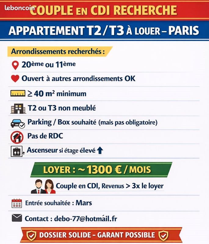 Couple en Cdi à la recherche d’un logement T2 Budget de 1350€ (nous gagnons plus de 3x le montant du loyer) N’hésitez pas à me Bien à vous