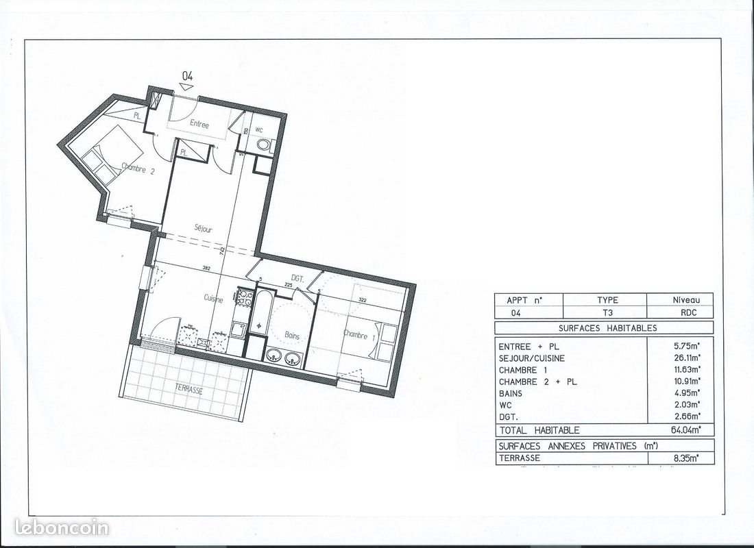 Appartement 3 pièces 64m2 + terrasse 8m2 disponible de suite Appartement lumineux de 64 m2 situé en Rdc avec jardin d'une résidence sécurisée de 2016 aux normes Bbc. Il comprend une entrée, un séjour/ cuisine de 26m2, deux chambres avec placards, une sdb avec baignoire et un wc séparé. Cuisine ouverte sur séjour et semi équipée ( hotte, plaque, évier, meubles hauts et bas). Loué avec une place de parking en sous-sol Chauffage au gaz individuel. Loyer Cc 810€. Caution 780€