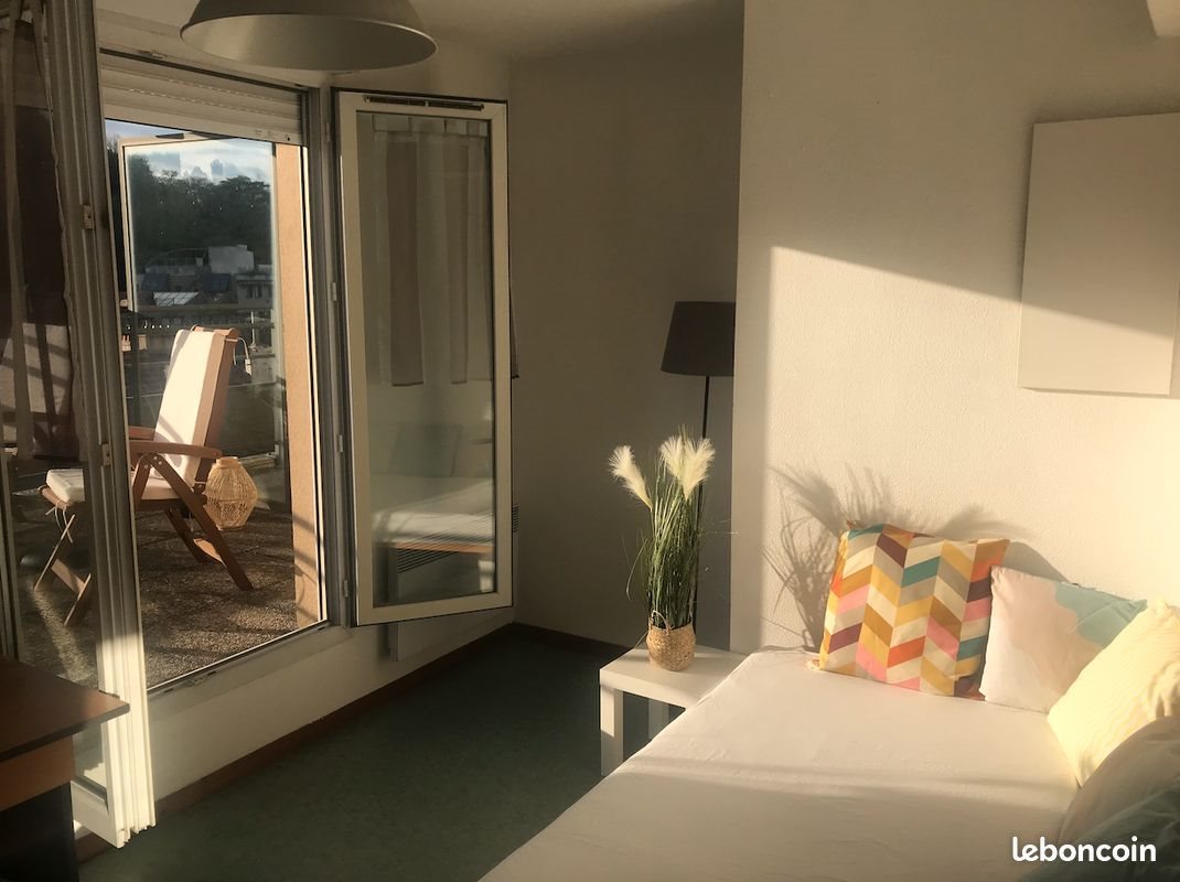 Appartement T1 meublé, entièrement équipé, soigné et très lumineux de 22 m2 avec une terrasse aménagée, situé au 7ème étage, sans vis-à-vis, avec ascenseur d'une résidence très calme pour étudiants, située en plein centre ville, à quelques pas de l'Université Jean Monnet, de l'IAE (200m) et à proximité du centre commercial Centre Deux et du Basic Fit. Les différentes écoles de la ville sont facilement accessibles en transport en commun (Tram, Bus), à trois minutes de la résidence : Iut, Iufm, Facultés des Sciences et Techniques, Institut Supérieur d'Economie... L'appartement est entièrement meublé: lit, table, bureau, chaises, grande penderie, plusieurs placards, et est équipé d'une kitchenette avec plaques électriques, évier, frigo, four à micro-ondes, cafetière Nespresso, vaisselle complète, ainsi que d'une grande salle de bains avec baignoire, lavabo et Wc. Volets roulants électriques sur les deux baies vitrées. Chauffage électrique individuel (abonnement à souscrire par le locataire). L'accès internet Wifi (Fibre) et l'eau froide sont compris dans les charges, ainsi que l'entretien des parties communes. La résidence bénéficie d'une laverie, d'une salle de sport, et d'une salle de détente à la disposition des locataires. Un gardien est également présent, 24H/24H. Appartement éligible aux Apl. Location en direct avec le propriétaire, sans frais. Loyer de 395 euros charges comprises. Dépôt de garantie de 395 euros. Garantie Visale acceptée.