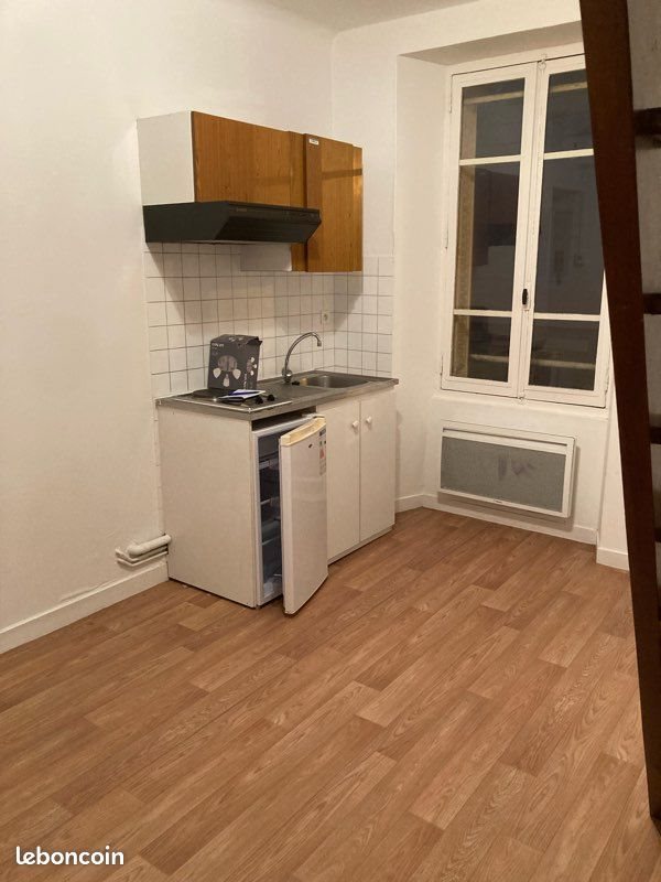 Appartement T1 bis à louer dans petite résidence de 8 appartements au 1er étage. Kitchenette pièce de vie et salle de douche avec Wc en bas. Escalier qui emmène dans la chambre sous comble. 16 m2 Loi carrez 30 m2 au sol.