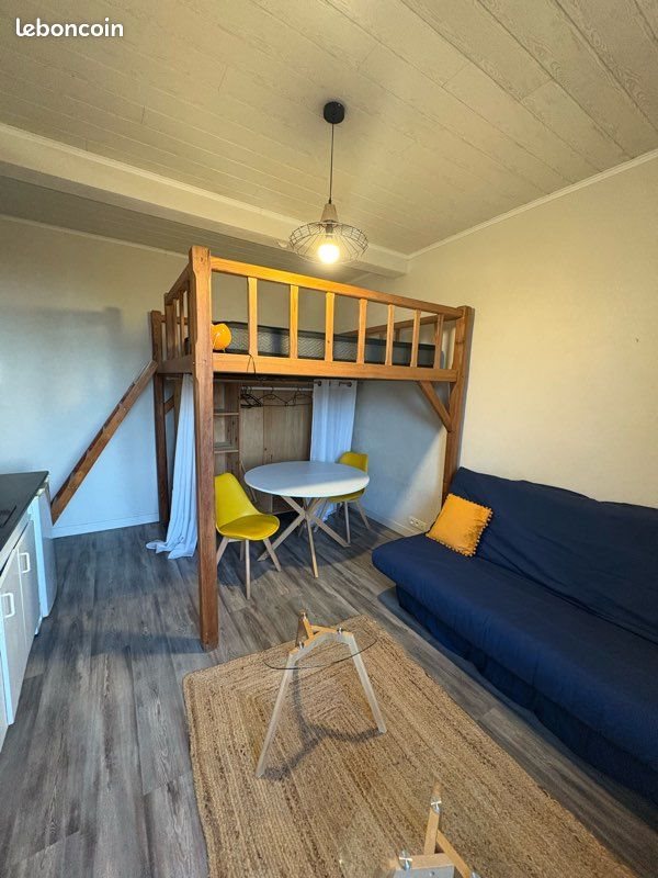 Appartement Studio, disponible à la location offrant : entrée sur pièces à vivre avec Coin, cuisine, équipée, mezzanine de couchage, salle de bain avec douche et meuble vasque