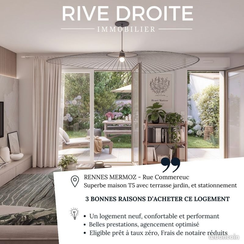 Maison de ville 5 pièces 85 m² Rive Droite - Yonathan Sourigon vous propose une belle opportunité à ne pas manquer : - Rennes - Rue Honoré Commereuc secteur Jean Mermoz/rue de Nantes - A quelques minutes de la gare Tgv et du centre ville, découvrez cette superbe maison de ville dotée de belle prestations, comprenant: Entrée, séjour salon de 30m2 donnant sur terrasse et jardin de 53m2, buanderie, wc, garage. A l'étage: 3 chambres, salle de bain, wc. Frais de notaire réduits - Coup de coeur assuré ! A Saisir Surface : 85 m² Consommation énergie primaire : 10 kWh/m²/an Consommation énergie finale : 0 kWh/m²/an
