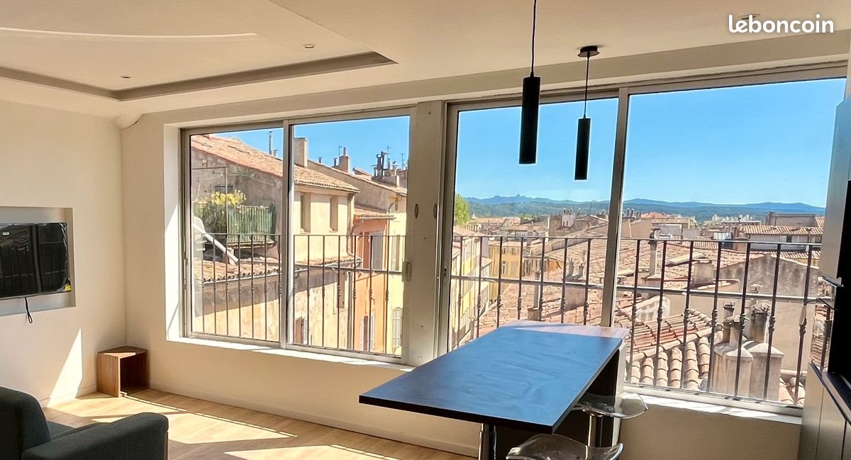 Idéalement situé dans le centre historique ( rue des cordeliers) Au calme , disposant d’une vue exceptionnelle sur les toits et le paysage au travers de sa baie vitrée de 5m de long. L’Appartement vient d’être refait à neuf, il est climatisé. Une chambre avec lit double et sa salle de bain. Deux couchages supplémentaires en mezzanine possible (accès difficile par une échelle) Séjour cuisine équipée Divers parkings publics à proximité. Appartement au 4 -ème étage sans ascenseur , escalier étroit . Proximité immédiate de place des cardeurs et ses restaurants en terrasse, 200m de place de la mairie ou Richelme , 300m du cours mirabeau et de la Rotonde ...