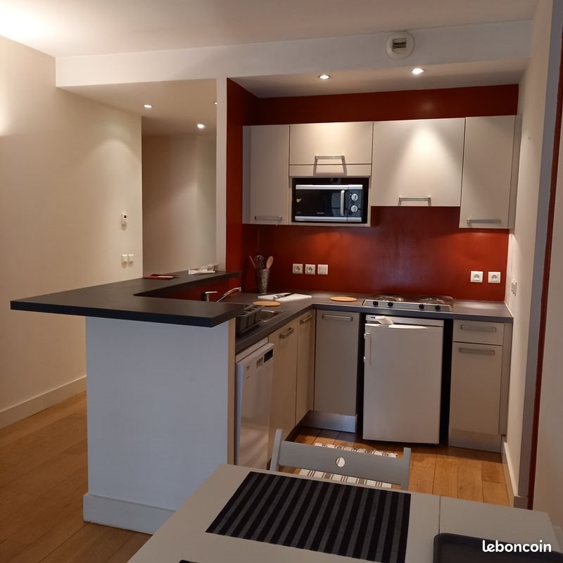 Grenoble Hyper centre appartement T2 50m2 traversant Est ,Sud- Ouest 5me étage avec ascenseur, comprenant une cuisine équipée Schmit lave vaisselle , micro- onde réfrigérateur ,plaque de cuisson électrique 4 X , donnant sur le salon salle à diner Salle bain , douche, vasque sur meuble de rangement, lave linge ..Wc séparés Chambre à coucher lit en 140, grand placard de rangement , bureau sur tréteaux, grand rideau occultant Le tout en parfait état