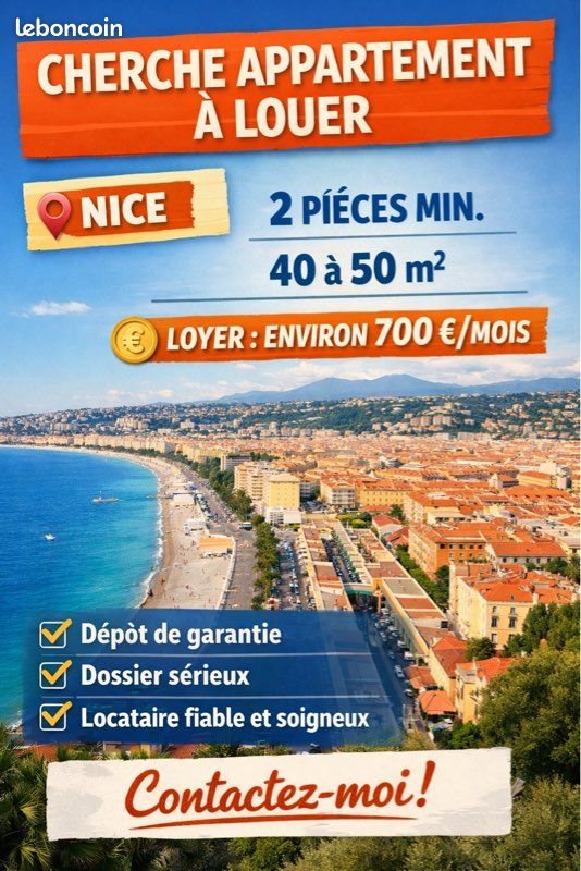 Bonjour, Je recherche un appartement à louer à Nice, idéalement : • 2 pièces minimum • Surface : 40 à 50 m² • Loyer : environ 700 € / mois • Dépôt de garantie possible • Garanties fournies • Personne soigneuse, respectueuse du logement (garantie de propreté et d’entretien) Je suis disponible rapidement et ouvert(e) à étudier toute proposition correspondant à ces critères. ? Merci de me par message ou téléphone.