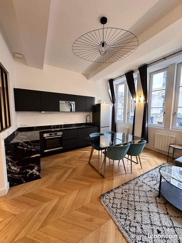 Appartement T2 idéalement situé en plein cœur de la Presqu’île. Nous mettons en location notre appartement de 51m² à partir du 16 décembre 2025. Ce bien est entièrement meublé et situé rue du Président Édouard Herriot, proche de l’église Saint Nizier entre Terreaux et Cordeliers, au premier étage d’un immeuble sans ascenseur du 1er arrondissement de Lyon (exposition ouest). Composé d’une entrée avec grand placard miroir, d’un salon et d’une cuisine ouverte totalement équipée (30m²), d’une chambre aménagée avec dressing (12m²) et d’une salle d’eau (5m²), ainsi que des wc suspendus séparés. L’Intégralité de l’appartement a été rénové en 2020 par des professionnels. L’Appartement est très bien isolé et chauffé par des radiateurs individuels électriques. Il dispose également de fenêtres neuves à double vitrage phonique, pour une meilleure insonorisation. Loyer charges comprises de 1 390€ / mois : • dont plafonnement de loyer majoré de 1015€ (soit 19,90€ le m²) • dont complément de loyer de 290€ (refait à neuf, prestations haut de gamme, parquet en chêne massif pointe de Hongrie, cuisine entièrement équipée avec plan de travail en granit, cave à vin, climatiseur portatif, hauteur sous plafond 3,10m) • dont provision pour charges de 85€. Dépôt de garantie de 2610€ (soit deux mois de loyer hors charges). Montant moyen estimé des dépenses d’énergie pour usage standard entre 130€ et 150€ par mois (non compris dans le loyer). Particulier à particulier - Pas d’honoraires d’état des lieux. Merci de nous transmettre par message le détail de votre dossier (situation, coordonnées et garanties), nous vous ons par la suite après en avoir pris connaissance. ⚠️ Agences s’abstenir s’il vous plait