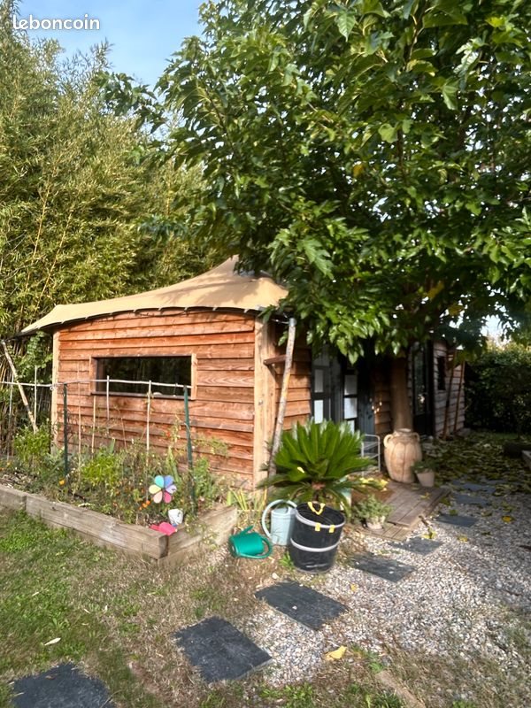 Lodge en bois isolé – 38 m² – 2021 – Idéal studio / espace bien-être Lodge en bois surélevé d’environ 38 m² (environ 11 m x 6 m au total), construit en 2021. Possibilité de faire le démontage et remontage sur un autre terrain si besoin (en sus). Caractéristiques : • Structure bois isolée (polystyrène + laine de verre) • 2 baies vitrées neuves, 1 fenêtre panoramique, 2 petites fenêtre en fer forgé • Grande porte en fer forgé • Poêle à bois pour le chauffage • Sauna individuel • Lit escamotable intégré (160 cm) avec matelas • Toit tente stretch : étanche, résistant au vent • Électricité : installation existante mais à prévoir selon le lieu • Pas de raccordement à l’eau et salle bain non deplacable (sauf toilettes, vasques et accessoires douches) A servi comme studio de yoga lumineux et cocon bien-être, et pour de la location courte durée. ✅ Idéal pour : studio autonome, salle de soins, bureau, espace détente, hébergement insolite… ? Plus d’infos, photos et visite sur demande.