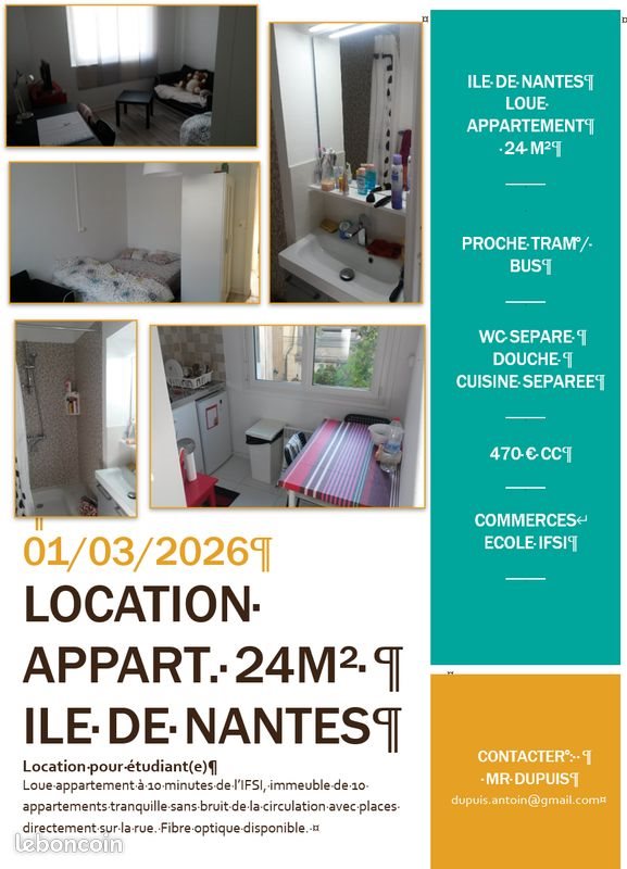 Location Appart. 24M² Ile De Nantes Location d'un appartement étudiant 1 pièce Non Meuble Appartement traversant au rez de chaussé situé dans une rue calme et dans un immeuble sécurisé. Une salle de bain avec douche. Wc séparé Cuisine équipée // plaque de cuisson électrique// réfrigérateur Fenêtres récentes double vitrage + chauffage électrique. Volets roulants Place de parking et place de scooter à proximités Proche du Tram Toutes commodités à proximité de l’immeuble. 1 mois de caution 440€ 440€ + 30€ de charge par mois Pas de frais d’agence. Disponible Le Merci de me par mail
