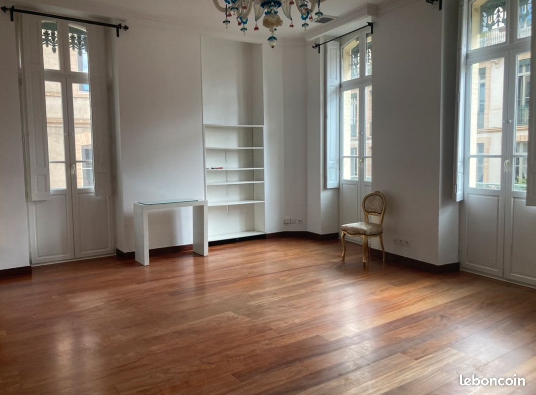 Adresse : rue de Bayard à Toulouse. Appartement 4 pièces de 108 m2 au 1er étage d'un très bel immeuble ancien. L'appartement est composé d'une pièce de vie très lumineuse, d'une cuisine entièrement équipée, de 3 chambres, d'1 dressing, de 2 salles de bains et de Wc, d'un balcon filant côté salon et d'un petit balcon à l'arrière du logement. En annexe, un garage fermé et un parking. Loyer = 1600 euros + 250 euros de provisions sur charges (chauffage inclus). Si vous souhaitez des informations supplémentaires sur le logement ou des photos complémentaires, n'hésitez pas à demander.