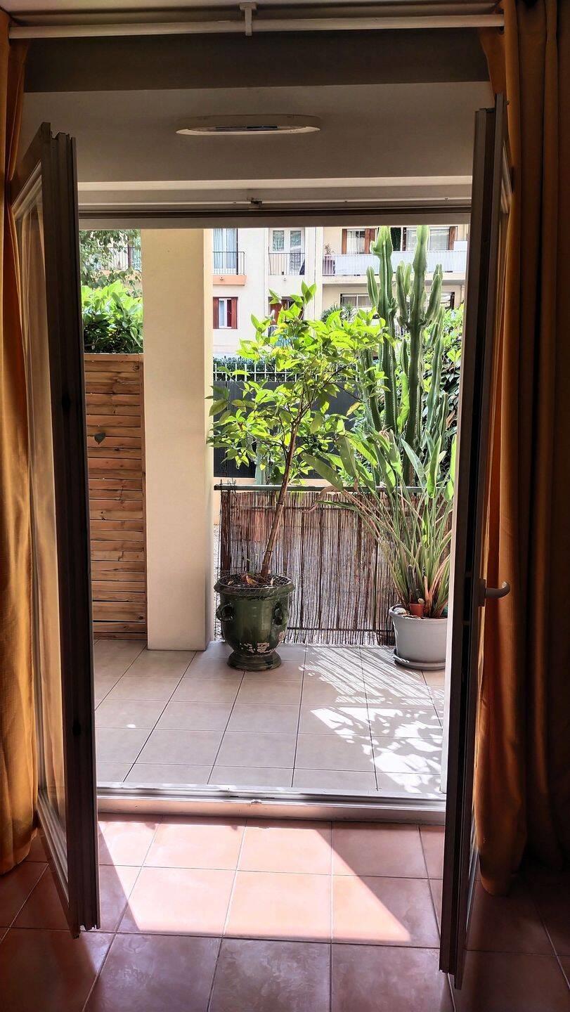 Studio 28.72 m2, Nice Madeleine, Rdc en retrait du boulevard, grande terrasse avec grille de protection neuve, vue sur jardinet, belle cuisine équipée, climatisation réversible récente, double vitrage. Deux grands parkings à moins de 30 mètres, proche commerces ...