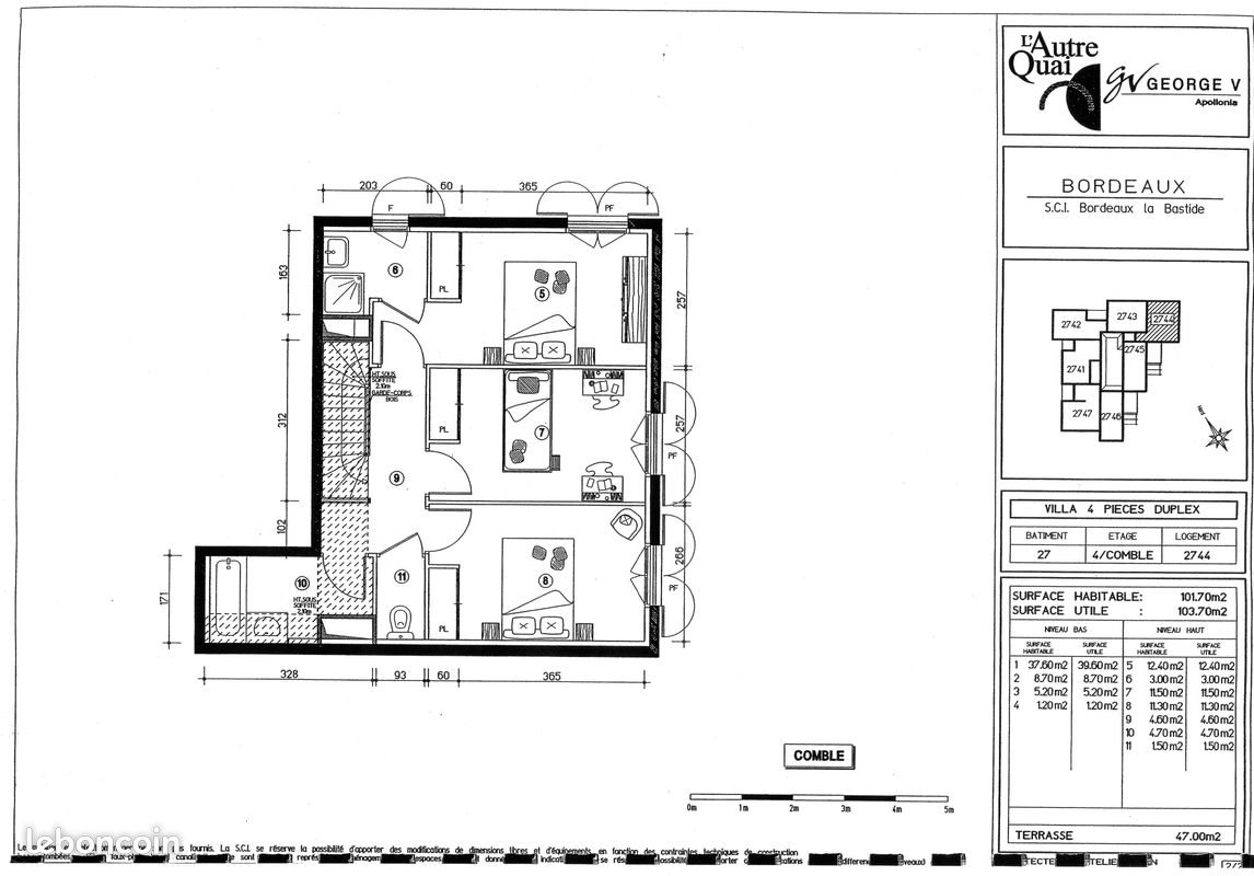 Bordeaux Bastide 18 rue Jean-Paul 4/5 pièce en duplex 103.70 m² + 47 m² de terrasse Résidence Bon standing 4ème étage entrée avec placard rangement Wc, séjour, cuisine équipée comprenant une plaque induction, un four micro-onde, un lave vaisselle, un lave linge, un four électrique. 5Ème étage palier 3 chambres avec placards rangement, salle d'eau, salle de bains, Wc. Au sous sol 1 place de parking. A proximité crèche, école, Tram A arrêt Stalingrad, Carrefour, Cinéma, jardin Botanique Loyer 1450 € Hc + 110 Charges = 1560 € Libre le 1 janvier 2026