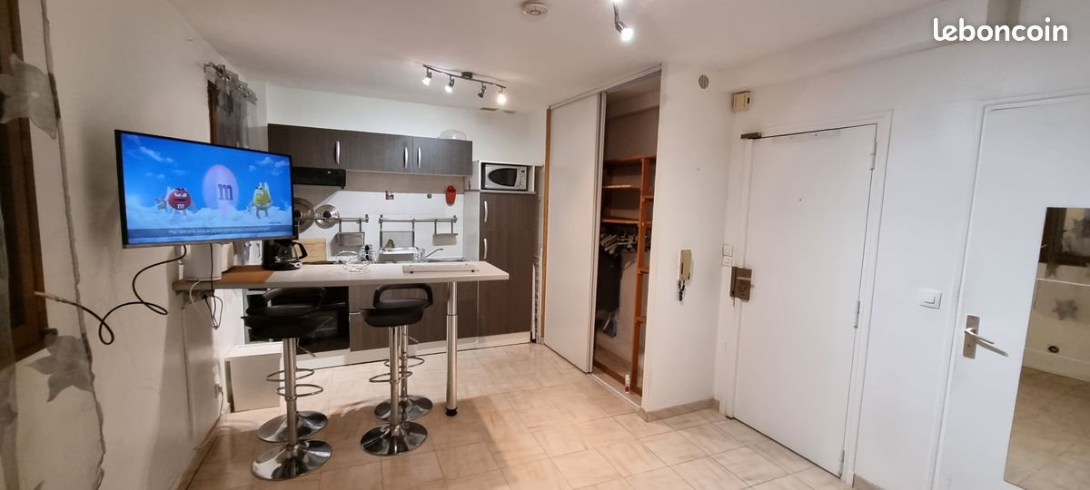 Loue pour étudiant studio meublé. Cuisine équipée : - kitchenette - réfrigérateur - évier - meubles de rangement - micro ondes - grille pain - machine à café/bouilloire - ustensiles de cuisine - assiettes, verres, couteaux, etc ... - lave linge - televiseur - penderie - bureau de travail - Clic-clac 140 190 Vous n'avez que votre linge de maison à emmener. Salle d'eau avec douche, armoire de toilette. Très propre et ensoleillé, équipé de fenêtres Pvc double vitrage. En plein coeur du village de mazargues et de tous ses commerces. A proximité directe du pôle universitaire de luminy et de la ligne de bus B1 Le prix comprend les charges générales et l'eau.
