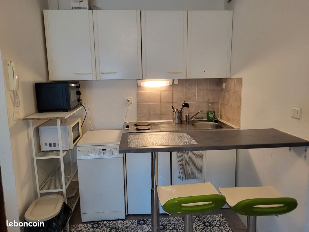 Dans bel immeuble, studio meublé lumineux, sur parquet. Cuisine complète équipée avec frigidaire, plaques électriques, four micro-ondes, placards hauts et bas. Bar,Sièges, Lave - linge. 2 fauteuils, table basse, Lit de 140, bureau, meuble de rangement. Bureau. Salle d'eau neuve. Loyer: 570 euros. Charges: 60 euros. Libre de suite