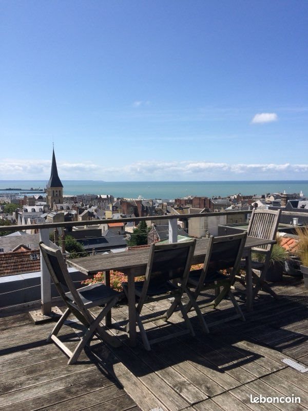 F3 plein de charme au 2 eme étage de notre maison, avec une terrasse plein sud de 50 m2 dominant la ville et la mer. 1 grand salon refait à neuf 1 cuisine aménagée 1 buanderie 2 chambres (1 grande et une petite) 1 salle de bain 1 coin bureau 1 Wc 1 entrée Possibilité d’un emplacement garage si la voiture est de taille moyenne Nous recherchons un ou des locataires calmes et sérieux !