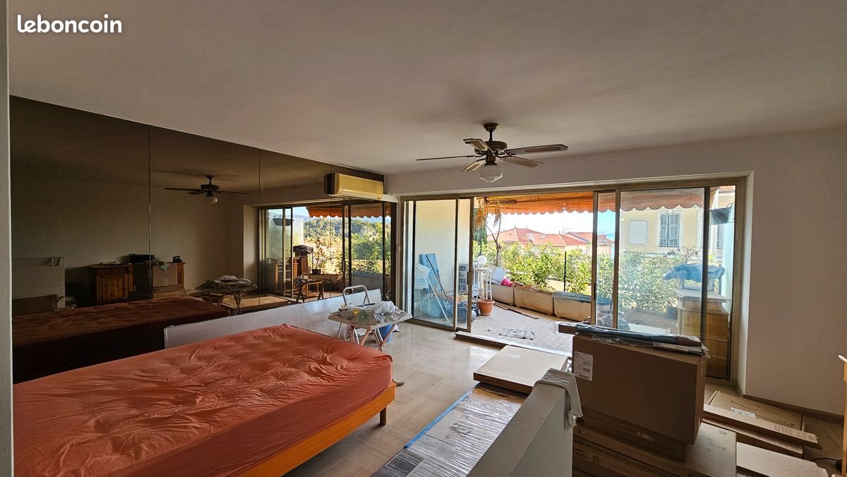 Grand studio vue mer en fin de rénovation complète, disponible dans une dizaine de jours. Il dispose d une grande cuisine totalement intégrée avec électroménager neuf. Salle de bain et meubles également neufs. Un pan de mur de cinq mètres de long entièrement en miroir fumé agrandit la pièce et met en valeur la vue. La résidence est sécurisée et possède un gardien. L arrêt de bus se situe au pied de l immeuble et la mer se trouve à cinq minutes à pied. Le studio comprend également un grand dressing de 3,70 m2 et une terrasse de 11 m2. Garantie loyers impayés demandée.