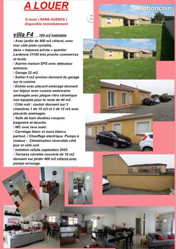 Villa F4 100 m2 habitable / Avec jardin de 400 m2 clôturé, avec mur côté piste cyclable, dans « impasse privée » quartier Lardenne 31100 très proche commerces et école. / Alarme maison Eps avec détecteur animaux. / Garage 22 m2. / Sellier 5 m2 environ donnant du garage sur la cuisine. / Entrée avec placard aménagé donnant sur Séjour avec cuisine américaine aménagée avec plaque vitro céramique non équipée pour le reste de 44 m2. / Côté nuit : couloir donnant sur 3 chambres 1 de 15 m2 et 2 de 12 m2 avec placards aménagés. / Salle de bain doubles vasques baignoire et douche. / Wc avec lave main. / Carrelage blanc et murs blancs partout. / Chauffage électrique. Pompe à chaleur: Climatisation réversible côté jour et côté nuit. / isolation refaite septembre 2025. / Terrasse carrelée couverte de 16 m2 donnant sur jardin 400 m2 clôturé.avec pompe arrosage.