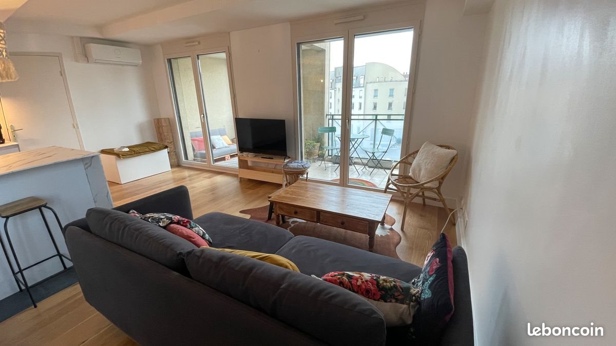Bonjour, Je mets à la location mon appartement de 60 m2 entièrement rénové en . Situé au 4ème étage (avec ascenseur) d'un immeuble année 90, l'appartement est parfaitement agencé - Hall d'entrée avec placard d’entrée et buanderie (avec machine à laver). - Pièce principale : Cuisine aménagée : îlot central, nombreux placards, entièrement équipée (combiné frigo-congélateur, plaque induction, four multifonctions, lave vaisselle, micro ondes). La cuisine est ouverte sur le salon. Dans le prolongement de la cuisine et du salon, avec accès par deux portes fenêtres : le balcon de 10 m² (un coin salon + 1 table et 2 chaises). - Les deux chambres sont l’une à l’entrée de l’appartement et l’autre à côté de la salle de bains. Chambre 1 : lit 140 x 190 cm avec tête de lit en tissus gris. Un placard type colonne. Coin dressing (penderie, tiroirs). Chambre 2 : lit coffre 140 x 190 cm avec tête de lit en velours vert. Un placard type colonne. Coin dressing (penderie, tiroirs). - Salle de bains : baignoire, lavabo avec meuble sous vasque et miroir, rangements. Sèche serviettes électrique. - Wc (wc suspendu - séparé de la salle de bains) Chauffage électrique dans tous l’appartement avec radiateur. Sèche serviette (avec soufflant) dans la salle de bains. Eau : cumulus plat Ariston. Pompe à chaleur réversible : chauffage en hiver, climatisation en été (le bloc extérieur est sur le balcon). Appartement fonctionnel avec de nombreux rangements. Au calme et lumineux, avec vue dégagée sur la grande rue de la Croix Rousse. Immeuble année 90. Bonne ambiance de voisinage. Les parties communes sont en bon état. Pour en savoir plus : L'appartement se situe au bout de la grande rue de la Croix Rousse, en retrait de l'agitation mais au coeur de la vie de ce quartier attractif. Transports en communs : station de métro Cuire (ligne D à 5 mn à pieds), nombreuses lignes de bus (dont un bus direct pour la gare Part Dieu en 20 mn), vélo'v. Accès aisé au périphérique depuis la montée de la Grande Boucle. Loyer en meublé : 1500 euros par mois (hors provision sur charge). Appartement disponible début novembre 2025. Location saisonnière / mobilité professionnelle possible (3 mois minimum). Idéalement : location en meublé classique. Me par mail ou sms pour toute visite ou renseignements complémentaires.