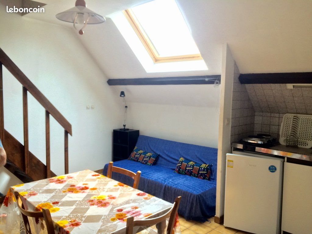 Au 1er étage d'une petite résidence,un appartement composé d'une pièce à vivre , avec cuisine toute équipée: réfrigérateur,plaque à induction,vaisselle,table, chaises, placards,etc. Salle d'eau avec cabine de douche et Wc. Au dessus en duplex, une chambre mansardée avec lit,table de travail,fauteuil de bureau,internet. Chauffage électrique,vitres à double vitrage. Proximité commerce et arrêt de bus. Loyer mensuel 495 € dont 35 € de charges .